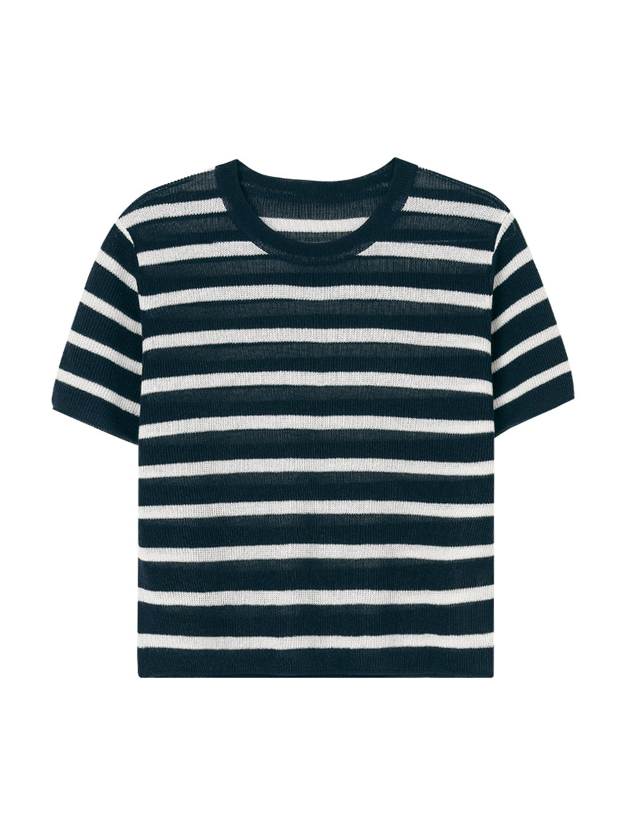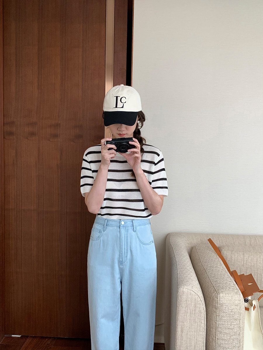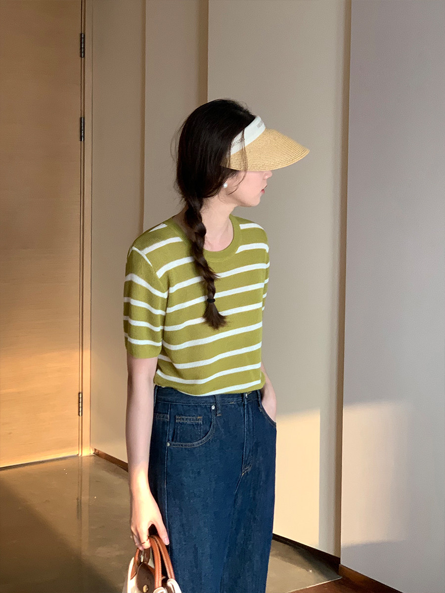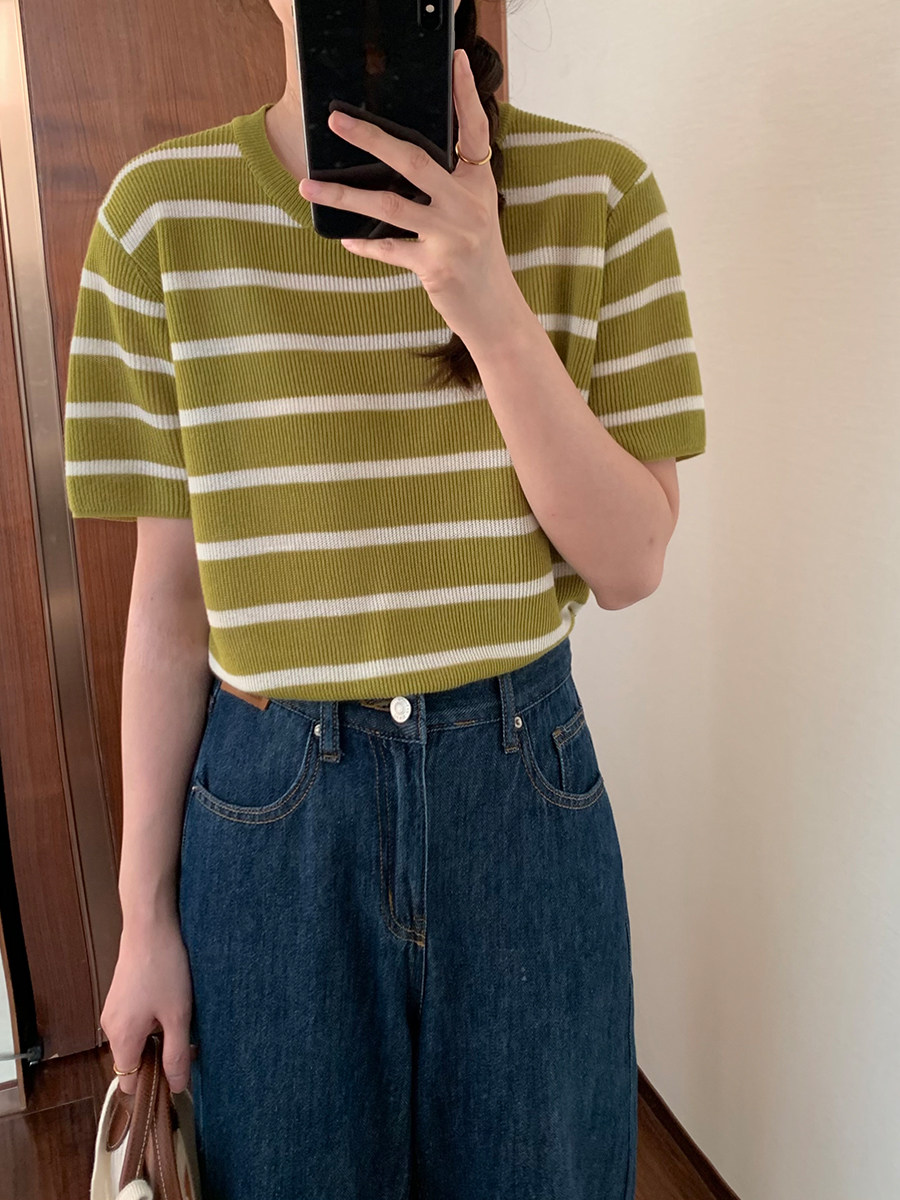 5siss color contrast striped knitted short-sleeved T-shirt women's 2022 summer new Korean version of the all-match round neck ice silk top