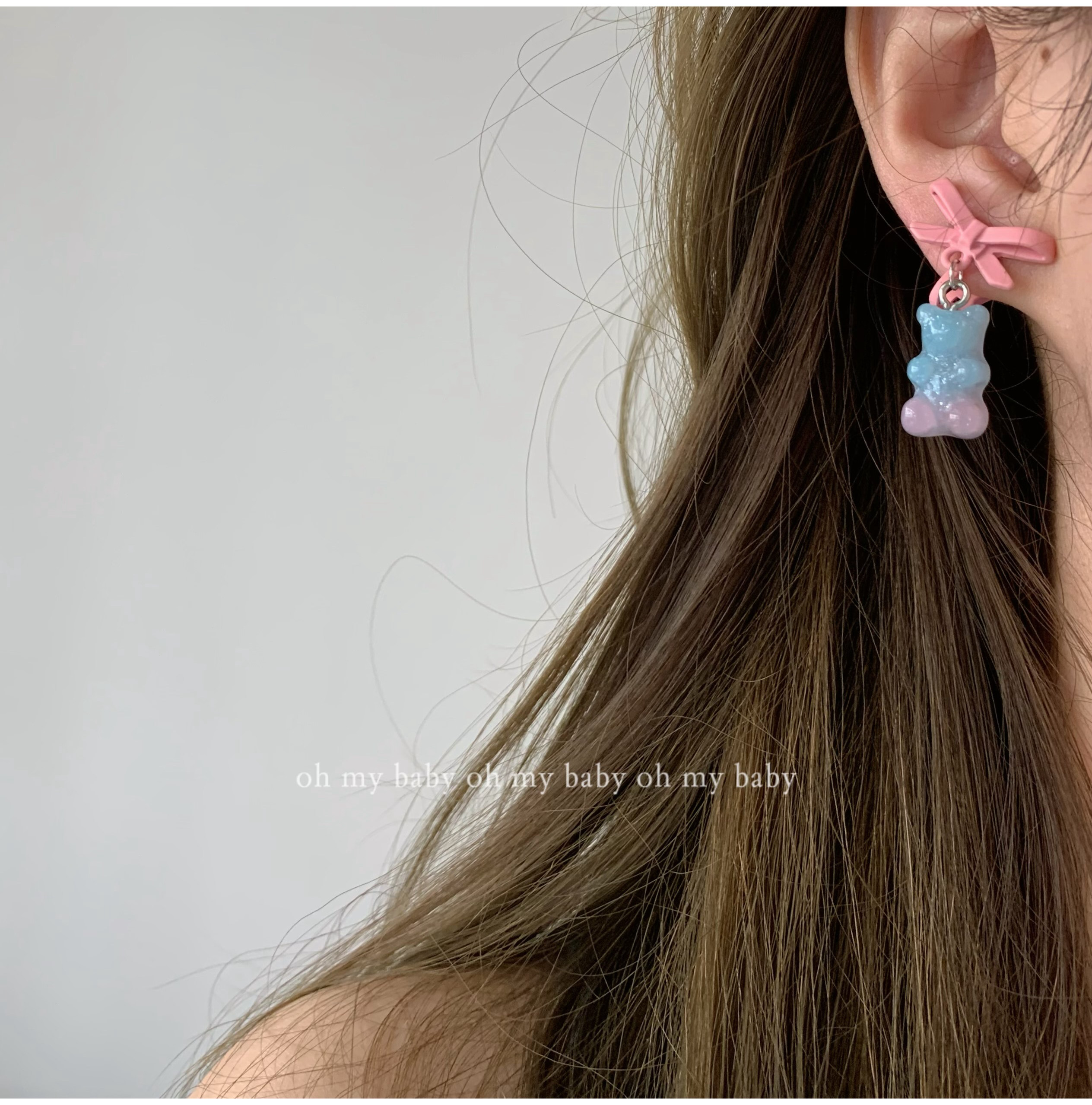 Jelly blue-pink gradient gummy bear bow earrings triangle ear clips without ear holes cute summer girl