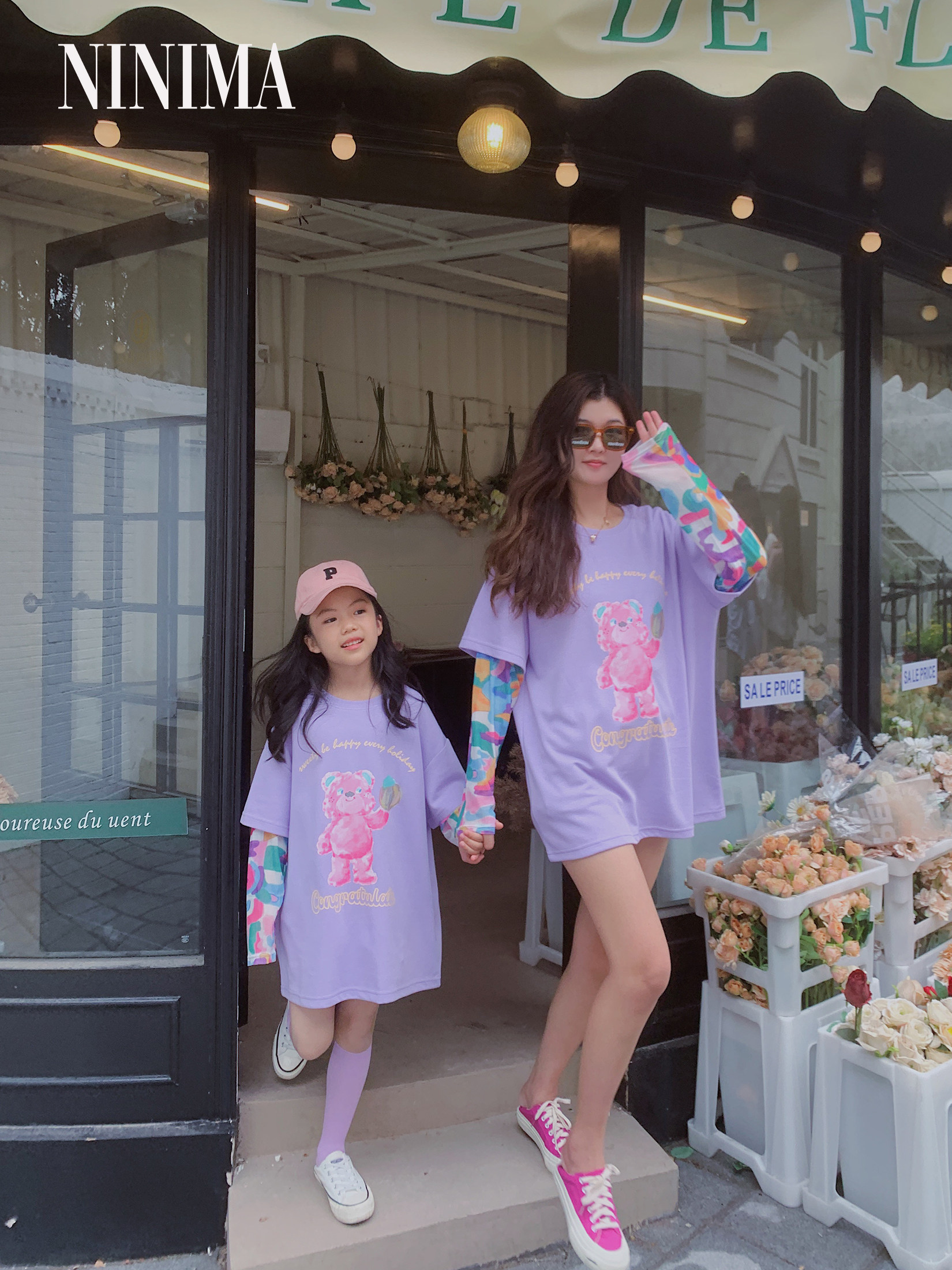 Nini mom summer new sunscreen cold sleeves stitching tender purple cartoon bear print fake two-piece T-shirt fresh