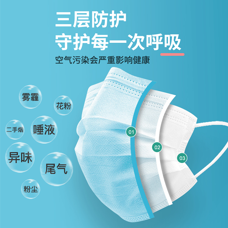 200 pcs black (with three layers of meltblown cloth) each individually packaged 1000 pcs of white (with three layers of meltblown cloth) Non-independent packaging 50 pcs bag Blue 2000 pcs (with three layers of meltblown cloth)