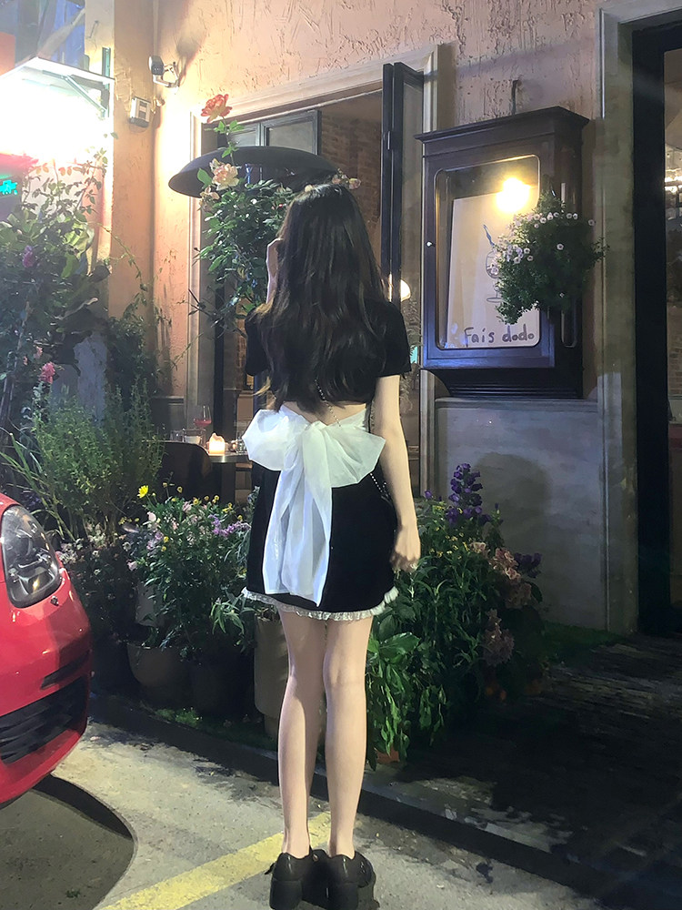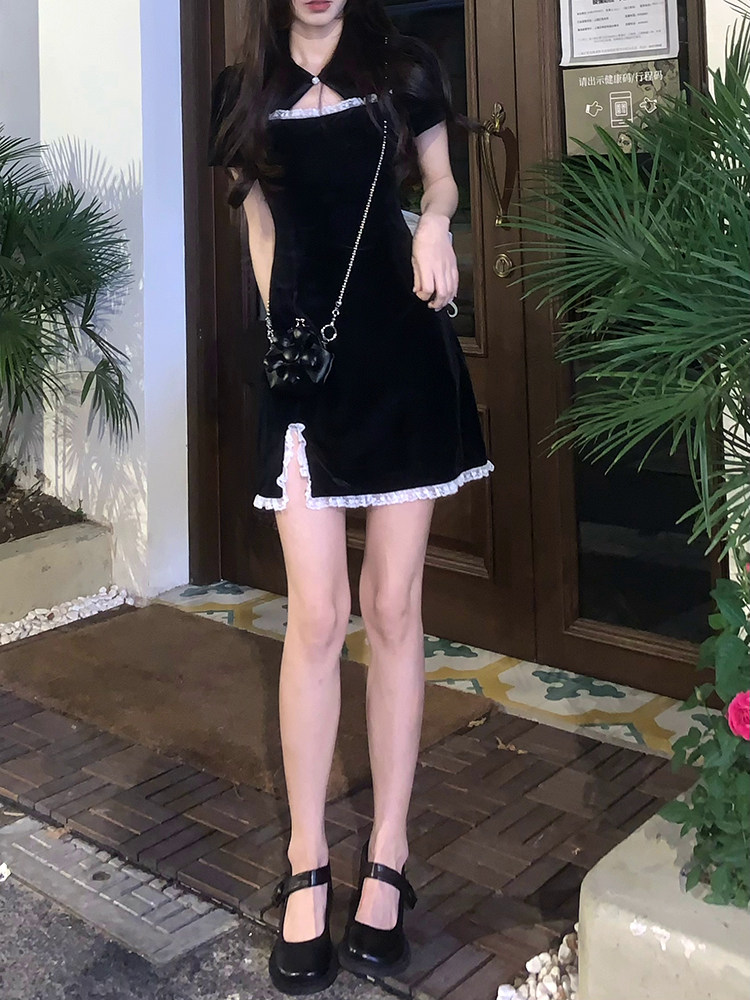 A sweet peach yikett "Daytime" dress female summer black slim temperament goddess fan cheongsam skirt