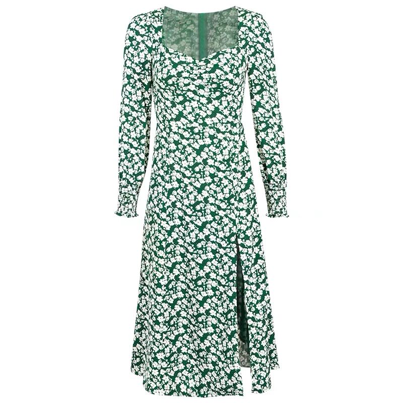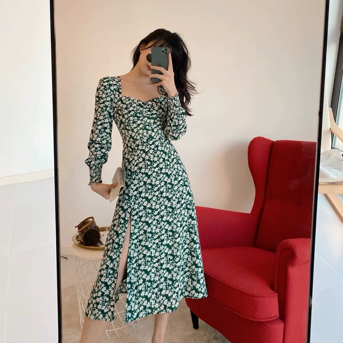 Reformation22 new new French style broken flower open fork long sleeve printed in long skirt with dress woman-Taobao