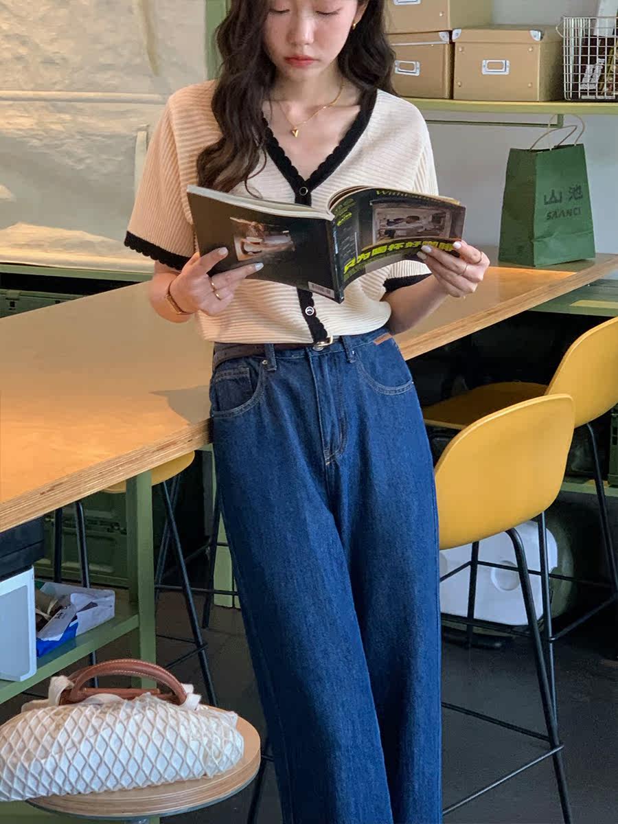 5siss retro blue straight jeans women's summer thin section high waist nine-point pants loose wide-leg long pants new