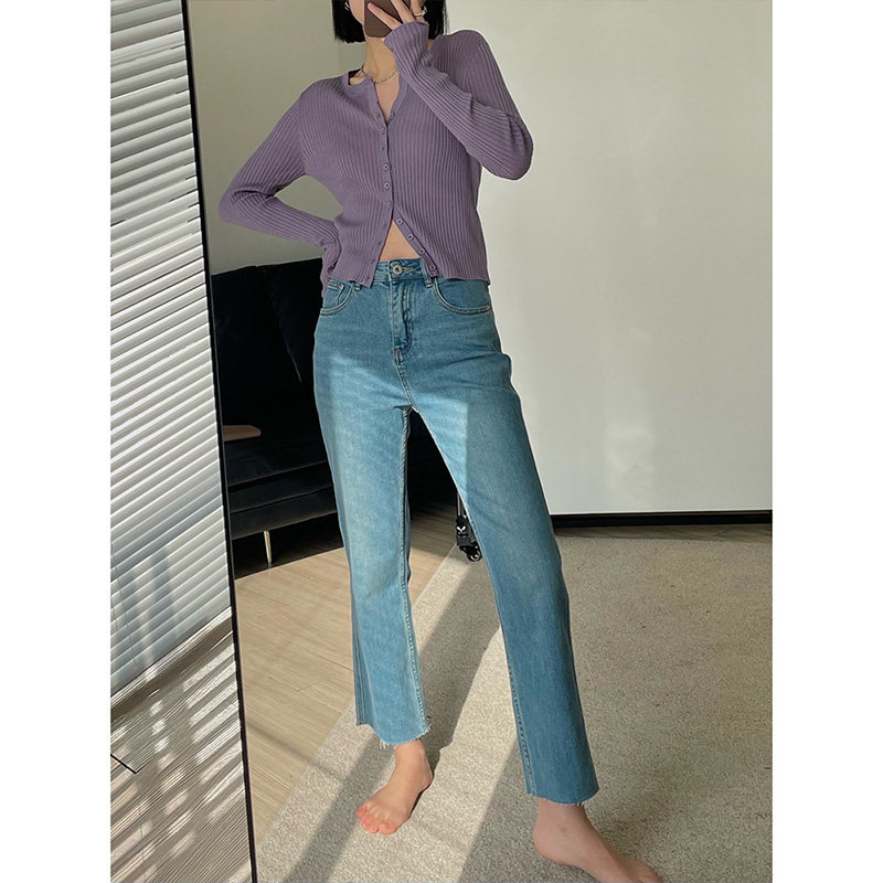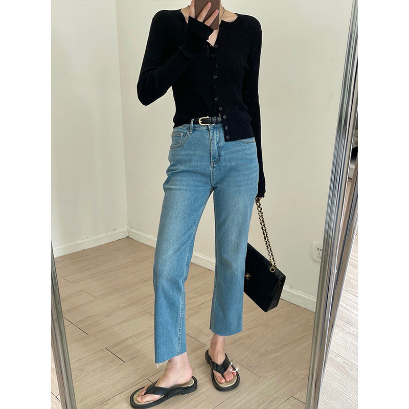 Thin straight tube raw edge jeans women's summer mm fat sister large size high waist thin pear-shaped figure pants nine points