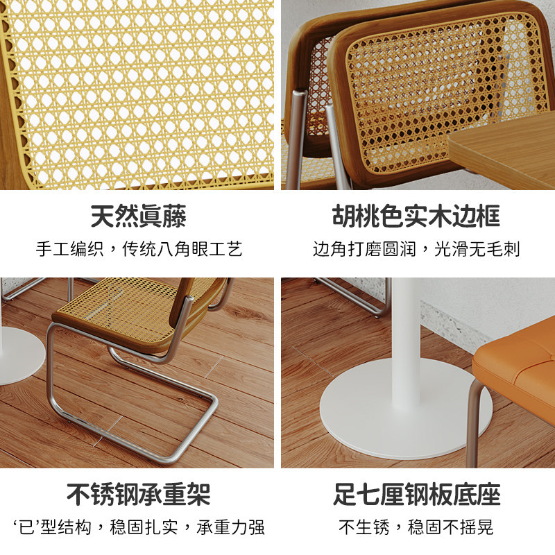 Round table (white steel plate base) Semi-round table (white steel plate base) Square table (white steel plate base) Rattan chair (soft wrap cushion) Rattan chair (solid wood rattan cushion) custom shot
