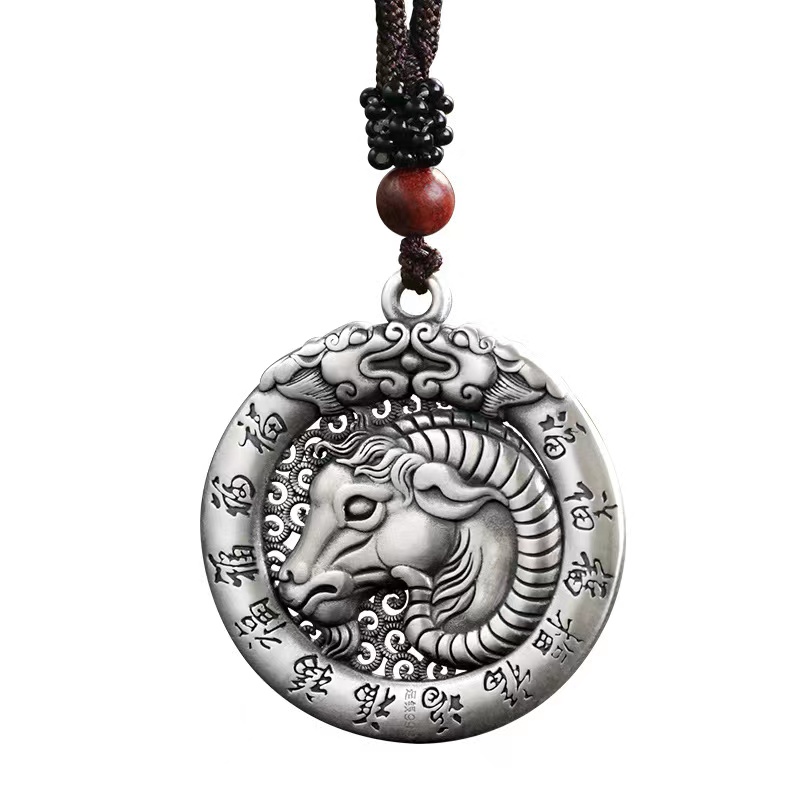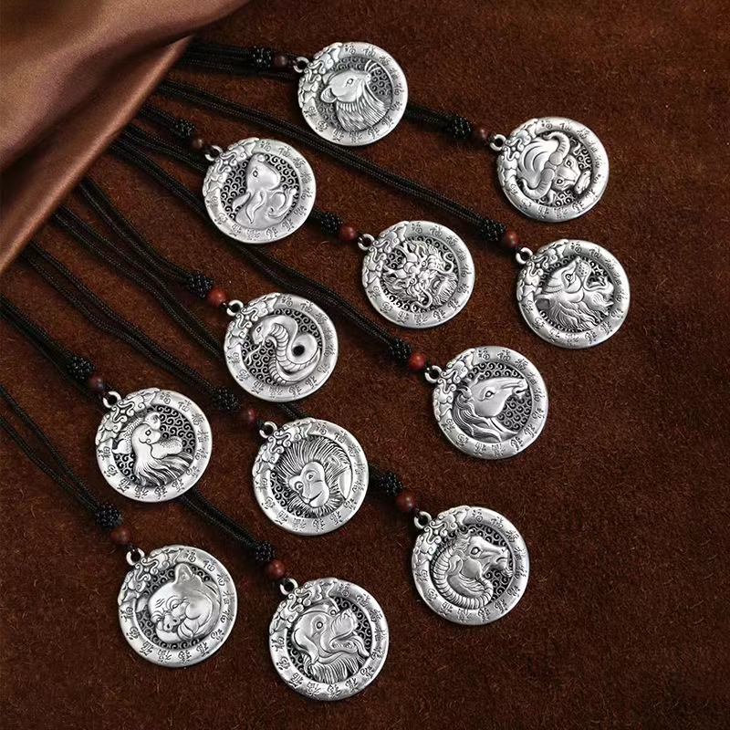 S999 foot silver bifacial duozodiac pendant men's Chinese wind girl amulet transshipment retro round necklace-Taobao