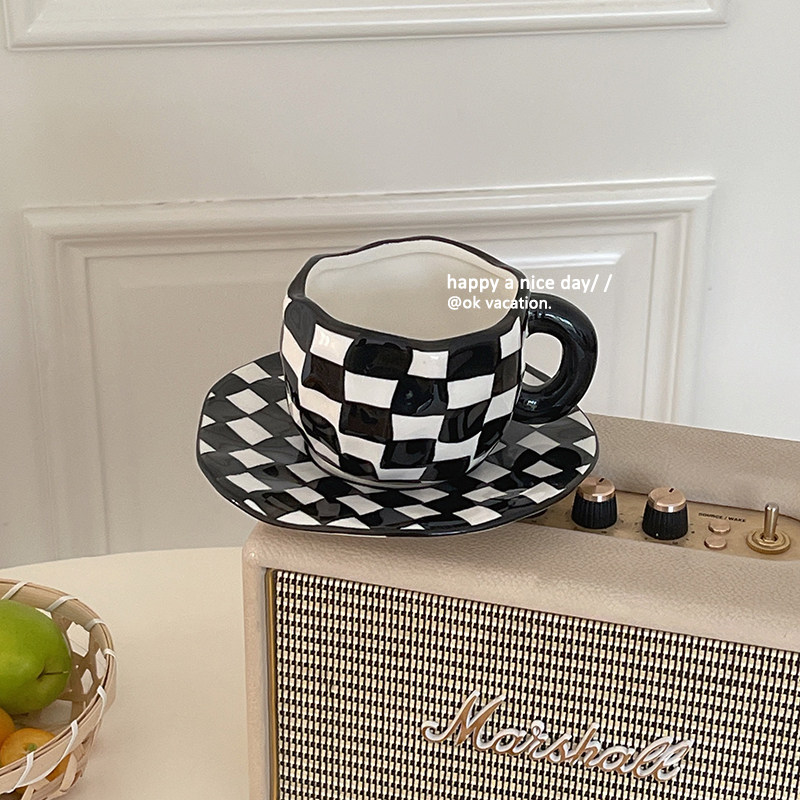 Pink grain cup yellow tulip cup disc pink flowers cup dish Blue sky white cloud cup dish black and white board plate cup cup disc