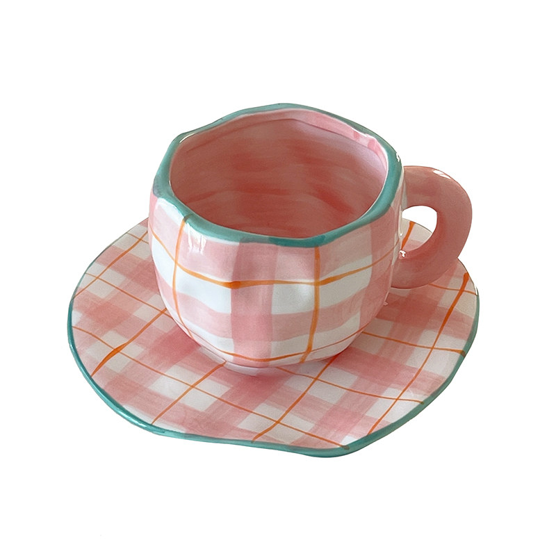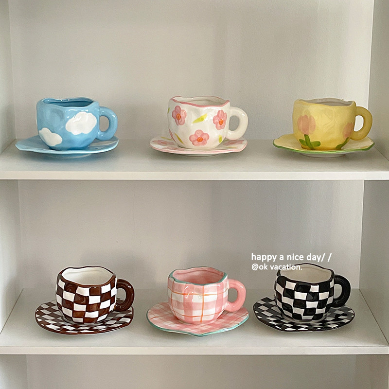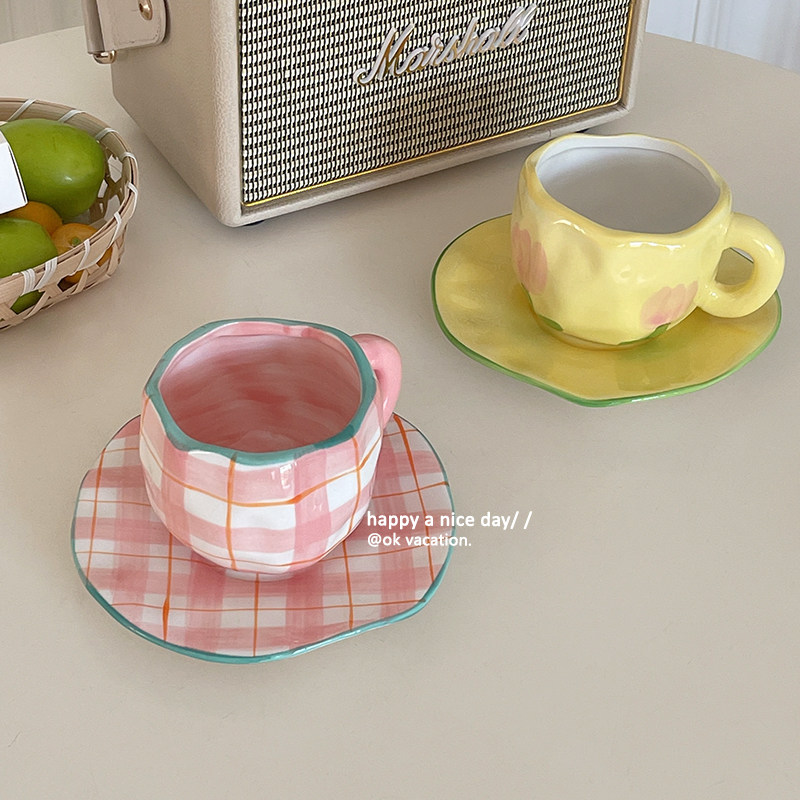 In irregular hand pinched coffee cup board pink yellow tulip flowers ceramic cup cup afternoon tea