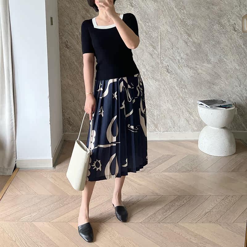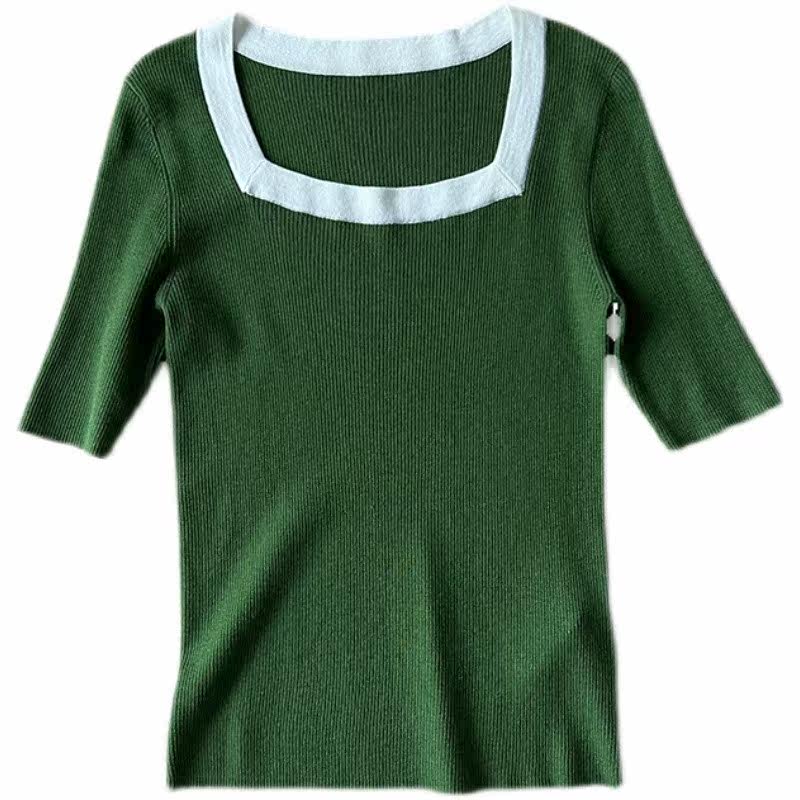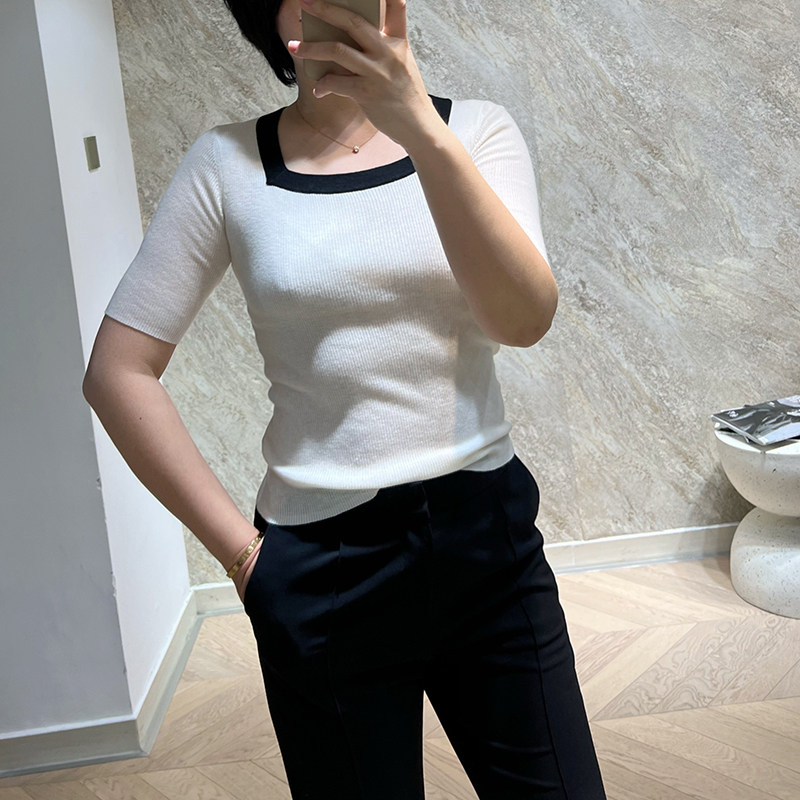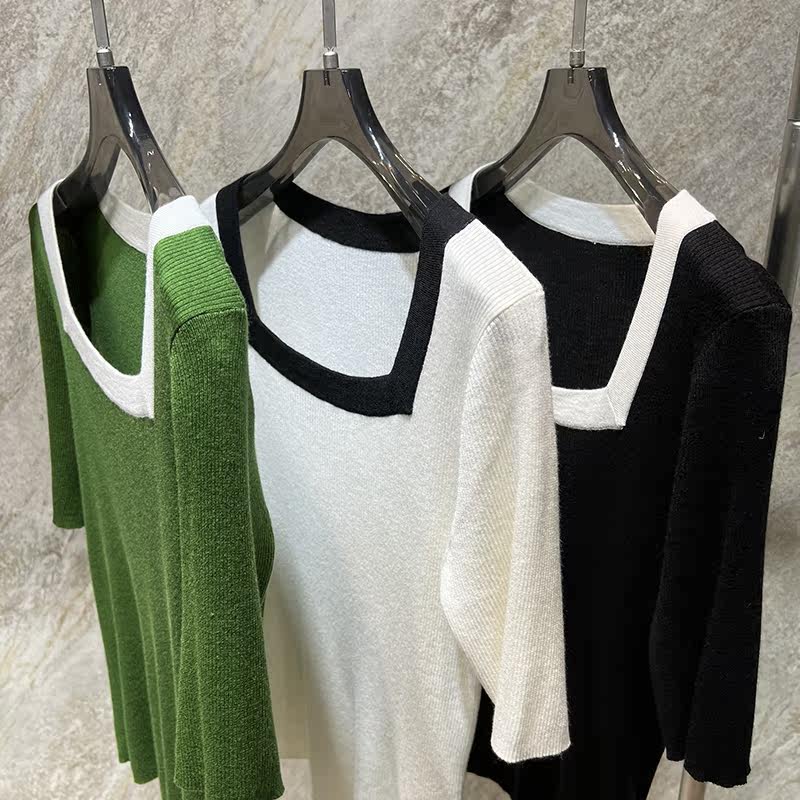 The square collar looks thin, it's really excellent. The pitted fine wool contrast color trimming digging collar short-sleeved knitted T-shirt 0518A4