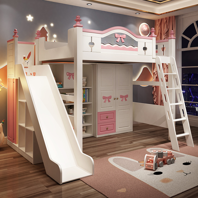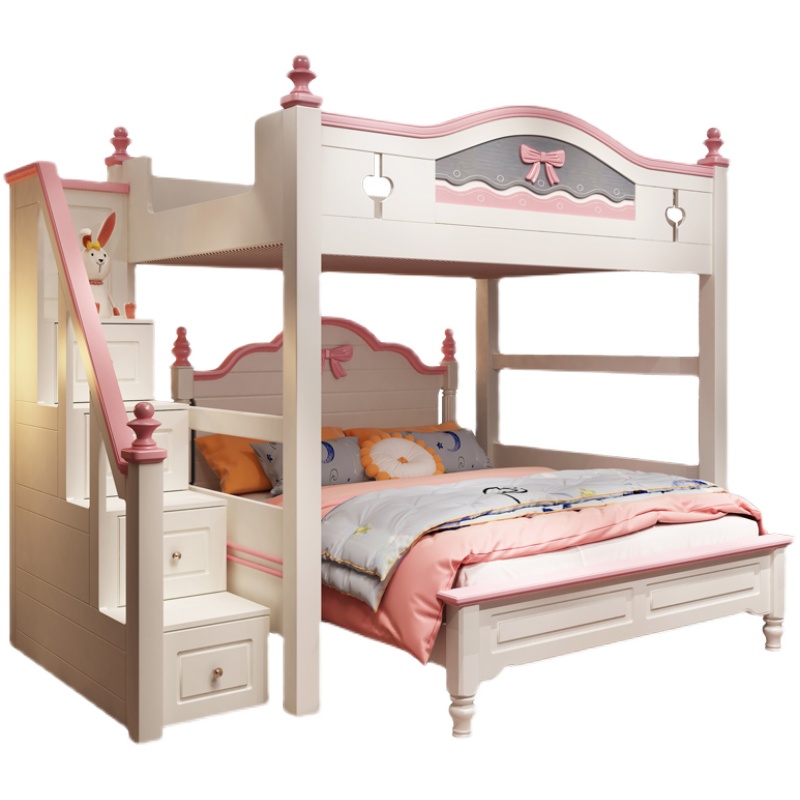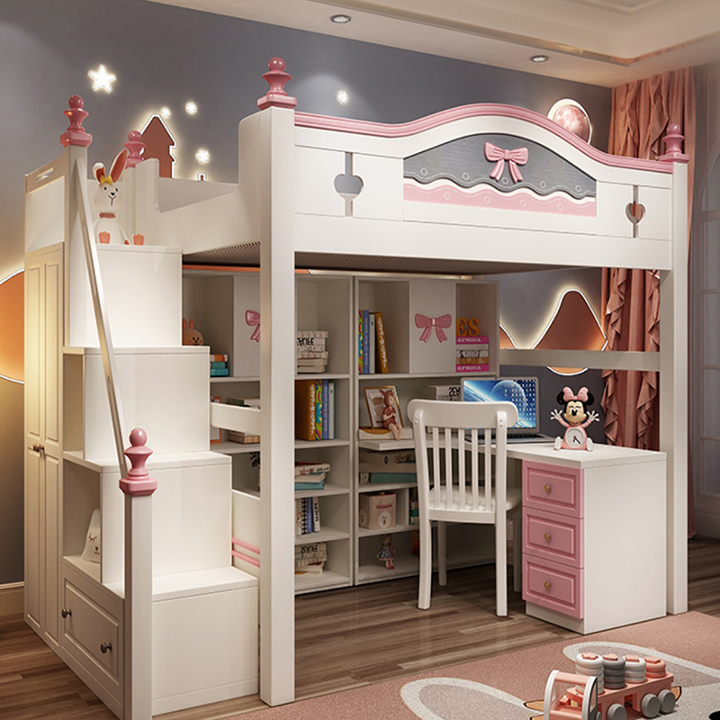 Children's bed girl princess bed under bed desk wardrobe multifunctional combination bow solid wood pink elevated bed