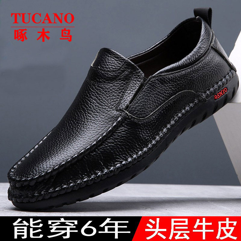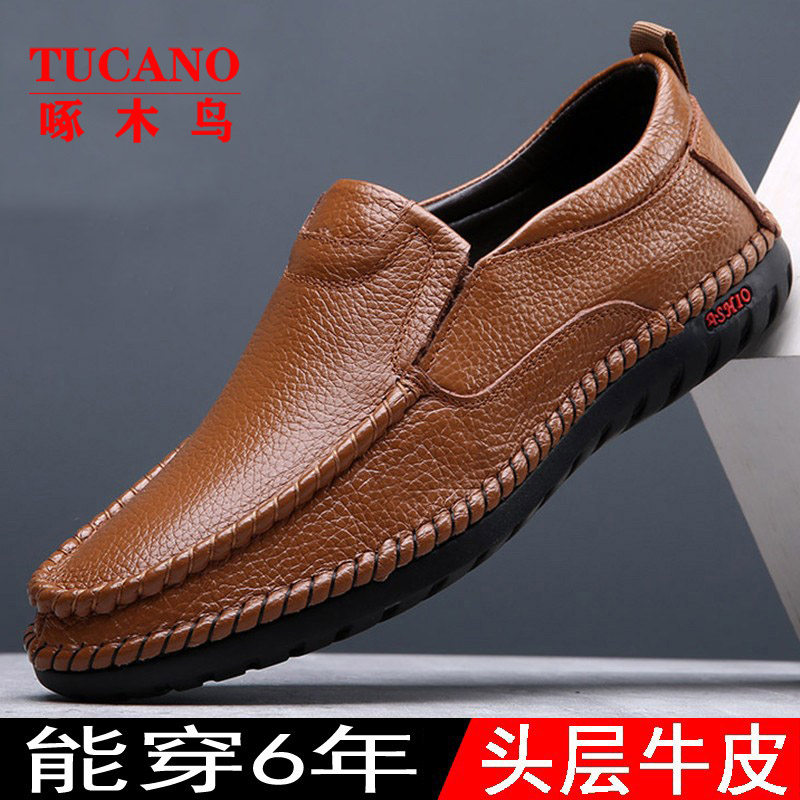 Woodpecker Male Shoes Genuine Leather Fall Breathable Casual Leather Shoes Men Soft Bottom Hollowed-out Bean-Bean Shoes Dad Shoes Inside Heightening-Taobao