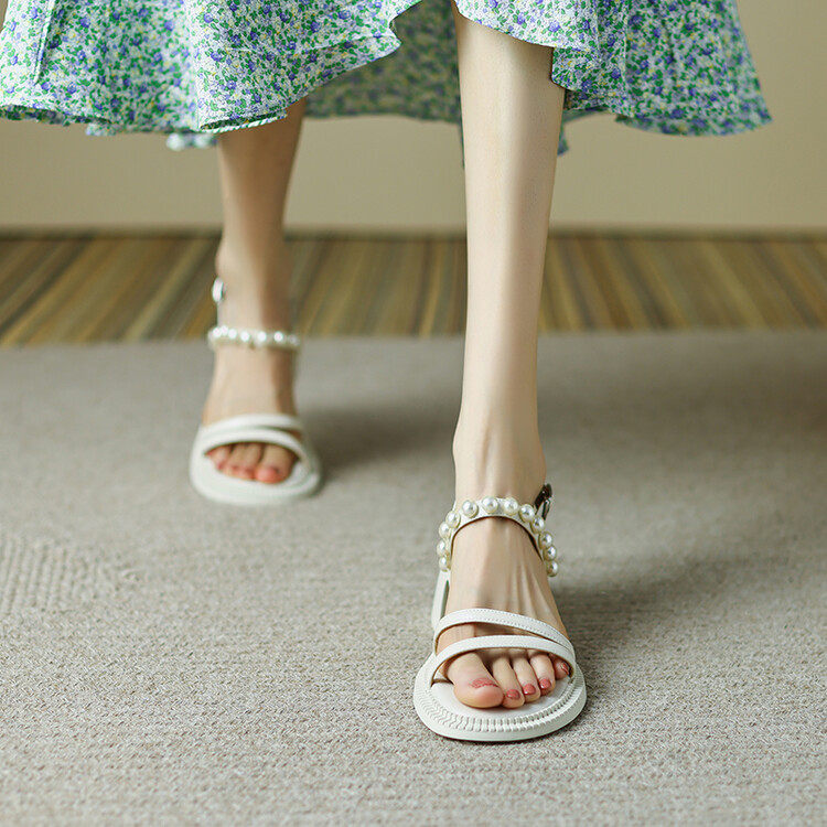 Large size fairy style leather sandals women's niche design pearl french buckle strap thick heel open toe high heels