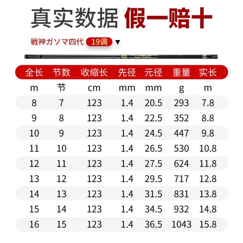 Japanese origin 19 tune 8 meters first three sections hard and slightly Japanese origin 19 tune 9 meters first three sections stiff Japanese origin 19 tune 10 meters first three sections stiff Japanese origin 19 tune 11 meters