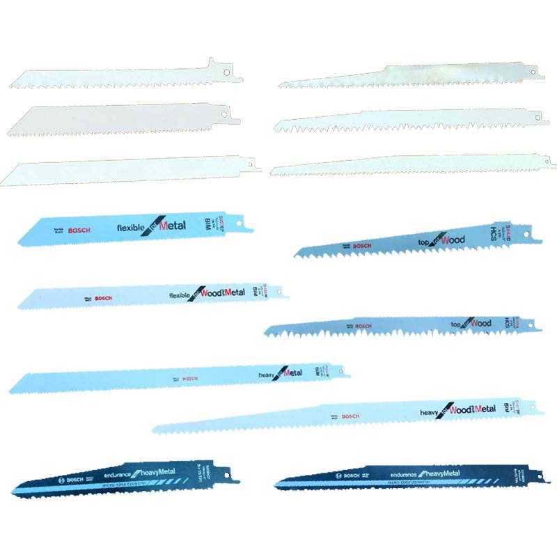The length of the metal saw blade is 30 cm. The length of the woodworking saw blade is 24 cm (large teeth). The length of the Bosch woodworking saw blade is 30 cm. The length of the metal saw blade is 22.5 cm.