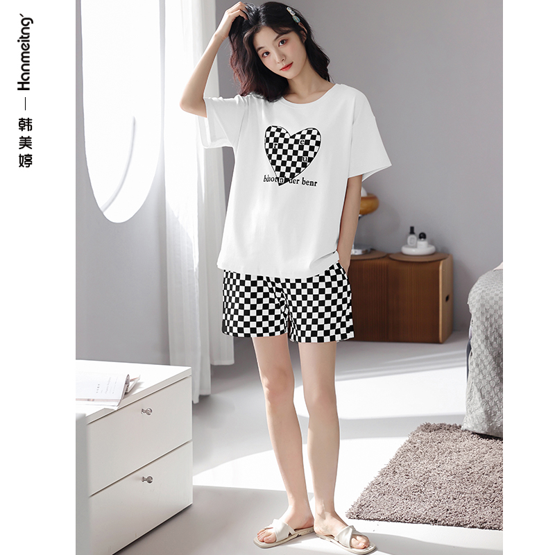 Sleepwear Women Summer Slim 2022 New pure cotton short sleeves Large size size Home Summer Chessboard Grid Shorts Suit