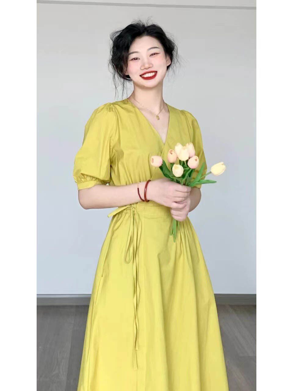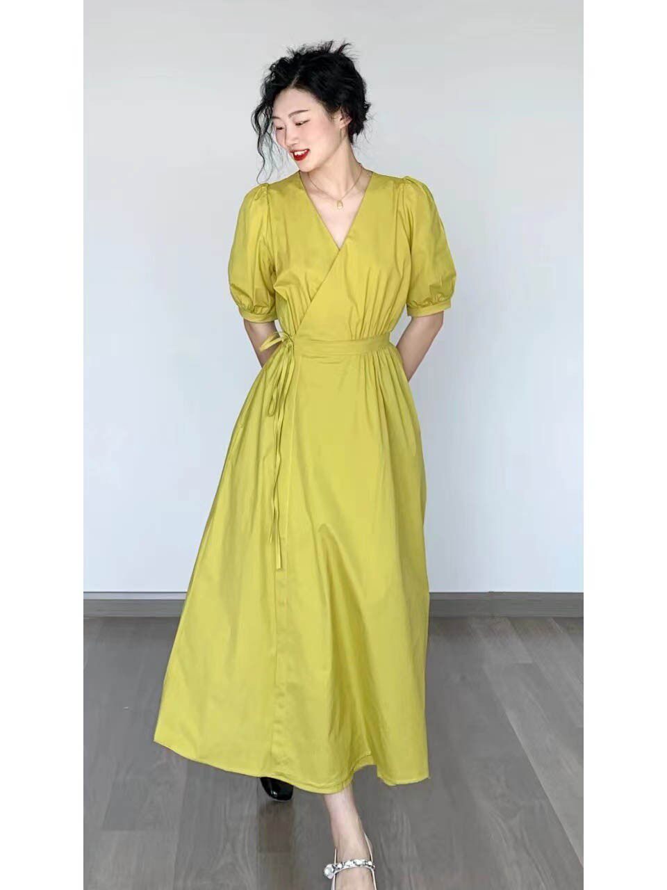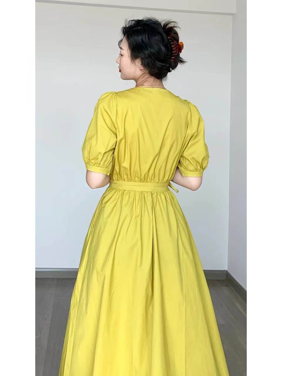2022 - The new French vintage bubble cuff with a soft dress with soft - air V - collar skirt