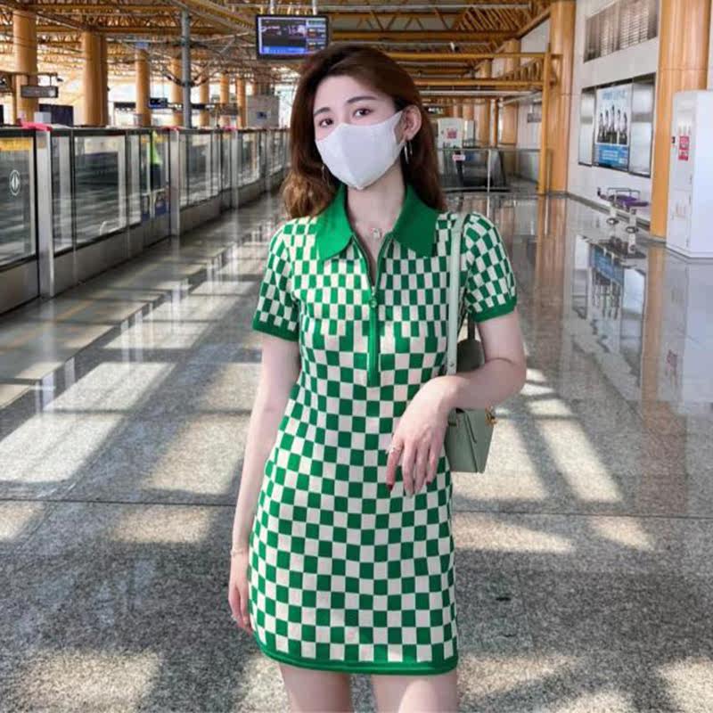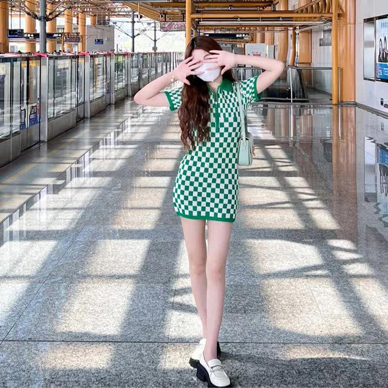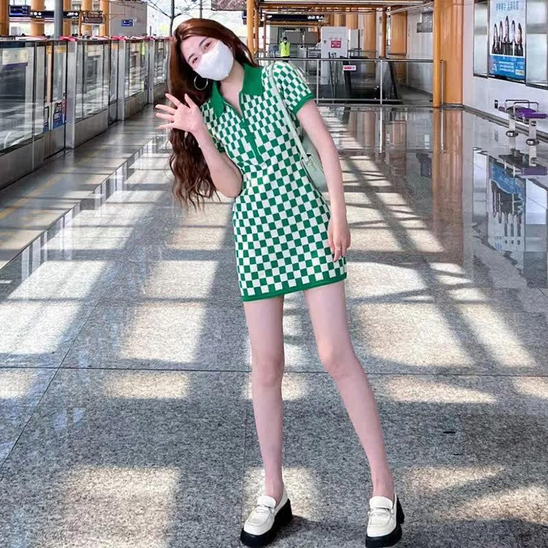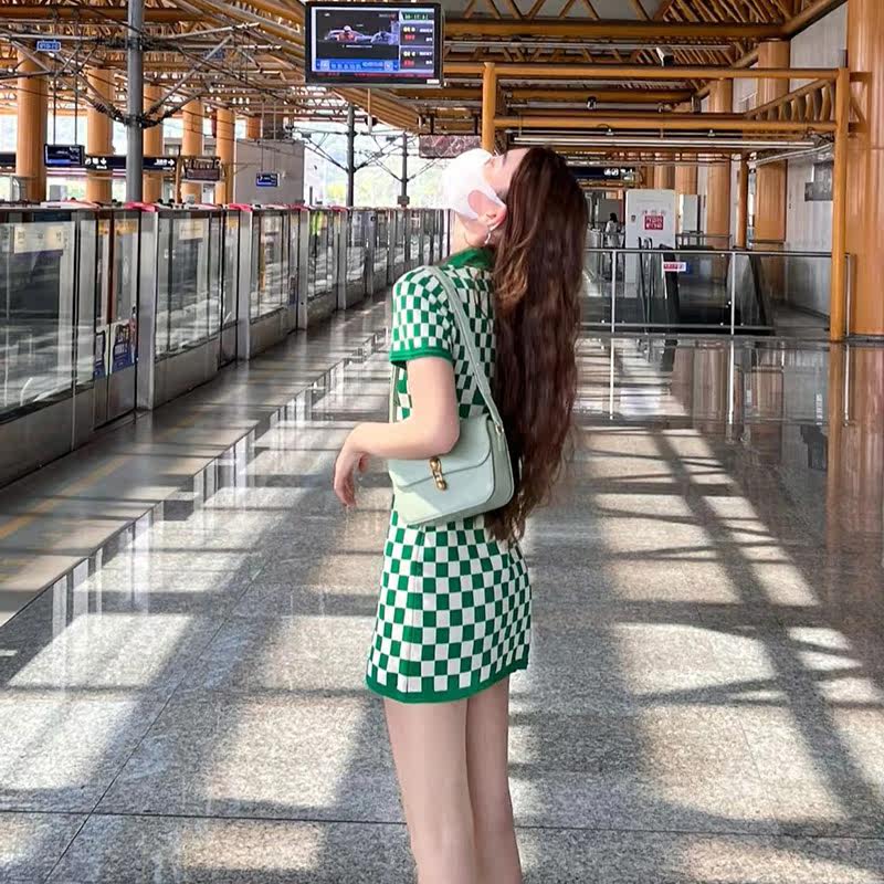 2022 Summer French Retro Chess board Polo collar knitted dress high - feeling temperament skirt and skirt