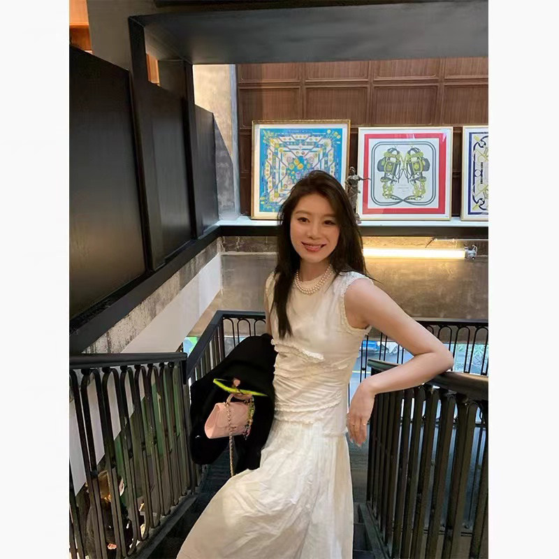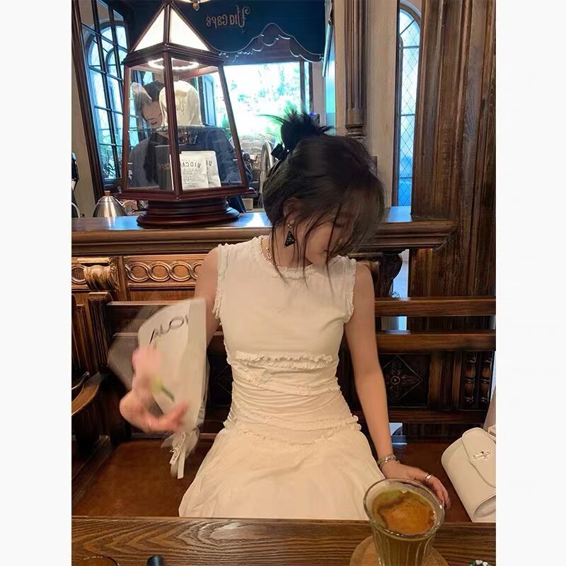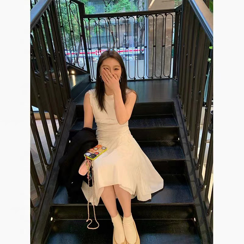 2023 Summer New French at the fugitive princess sleeveless white dress niche design temperament to collect waist cake skirt