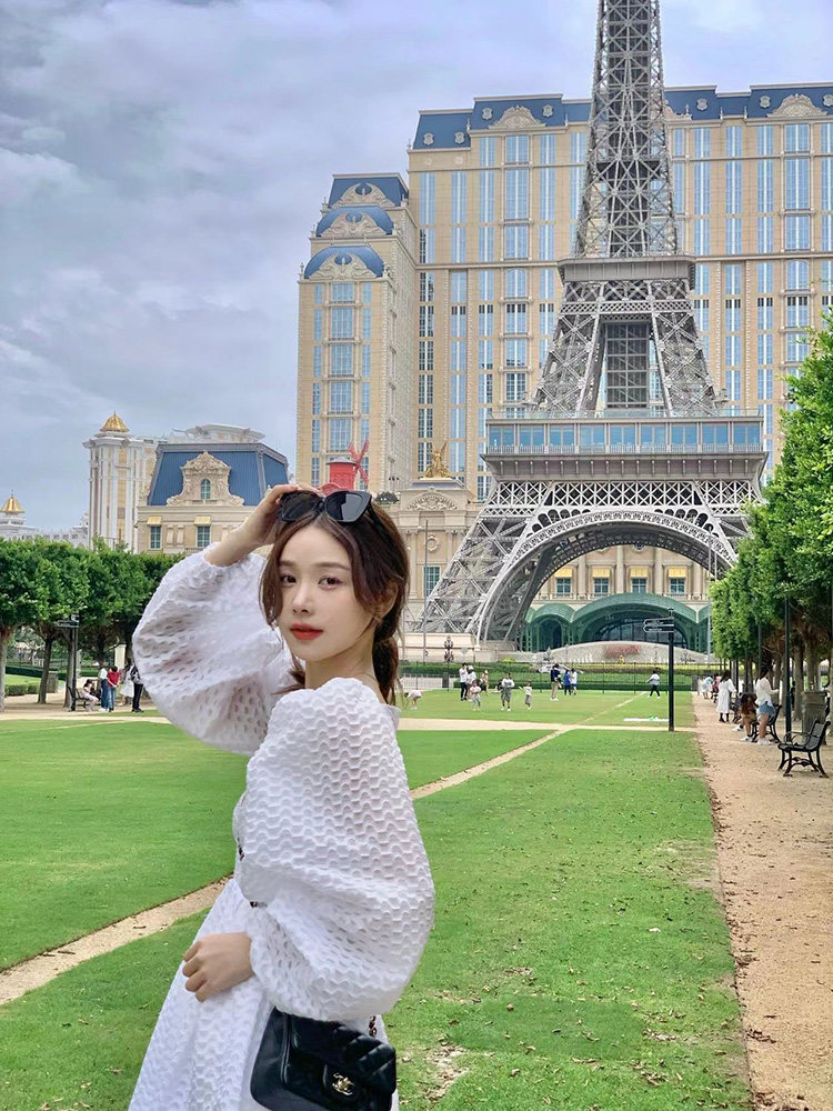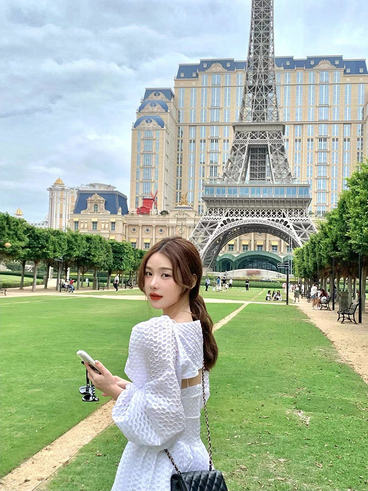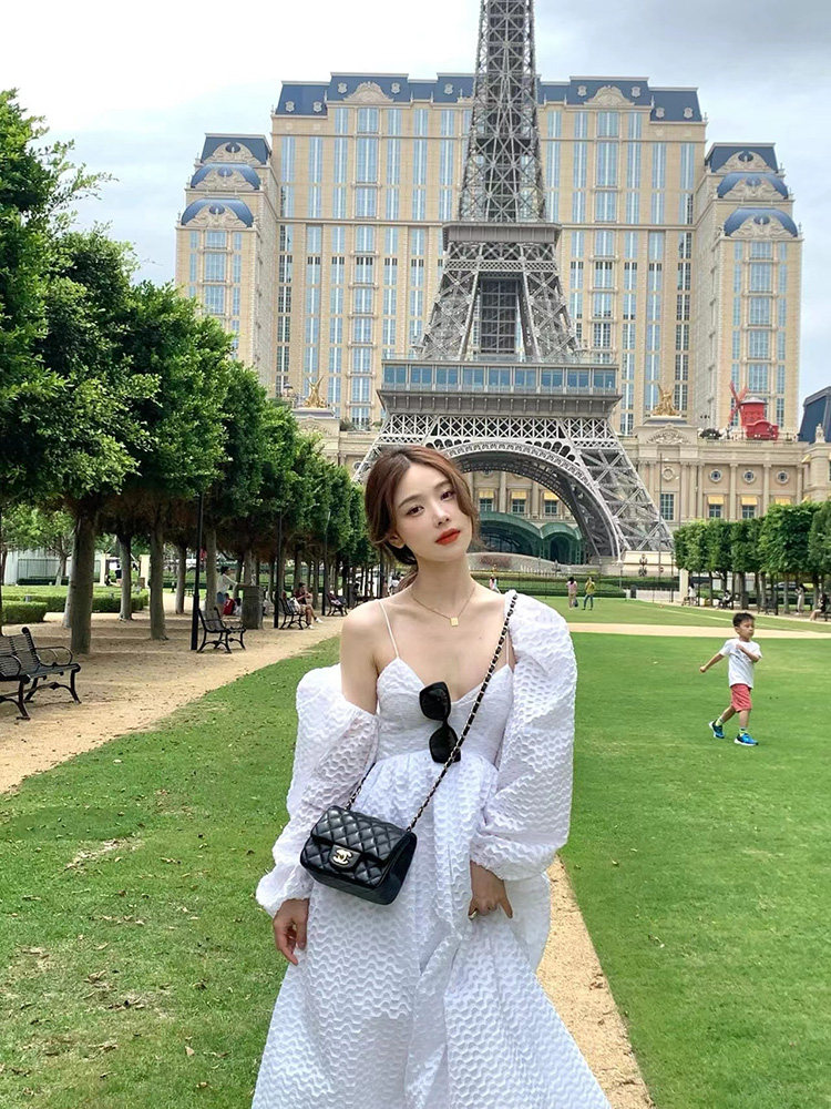 Summer New French niche design high-sense white hanging dress bubble sleeve shirt two suits