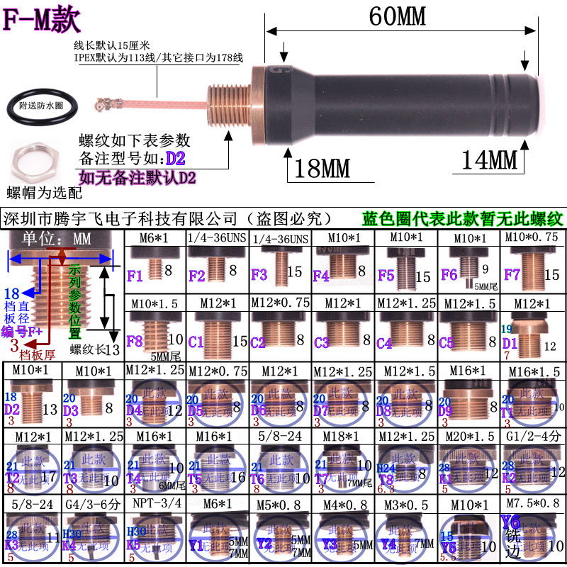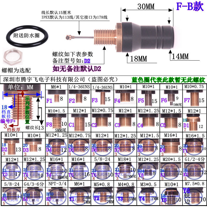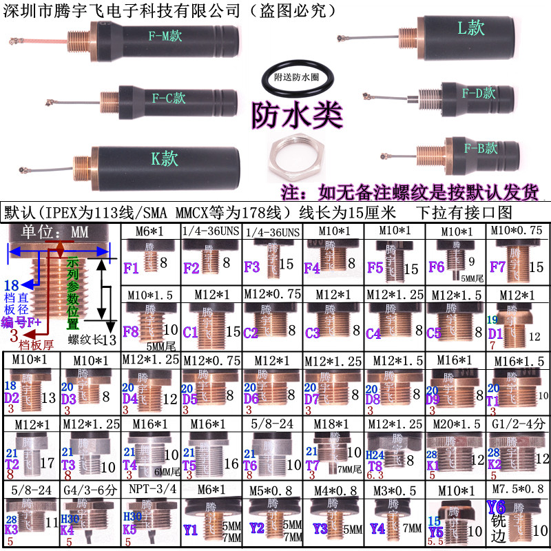 Waterproof IP68 67 65 M3 M5 M6 M10 M12 M16 M20 threaded antenna Wifi Lora Nb