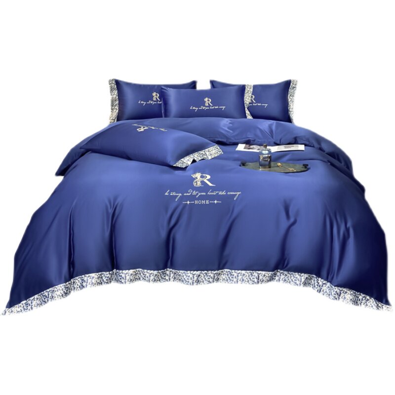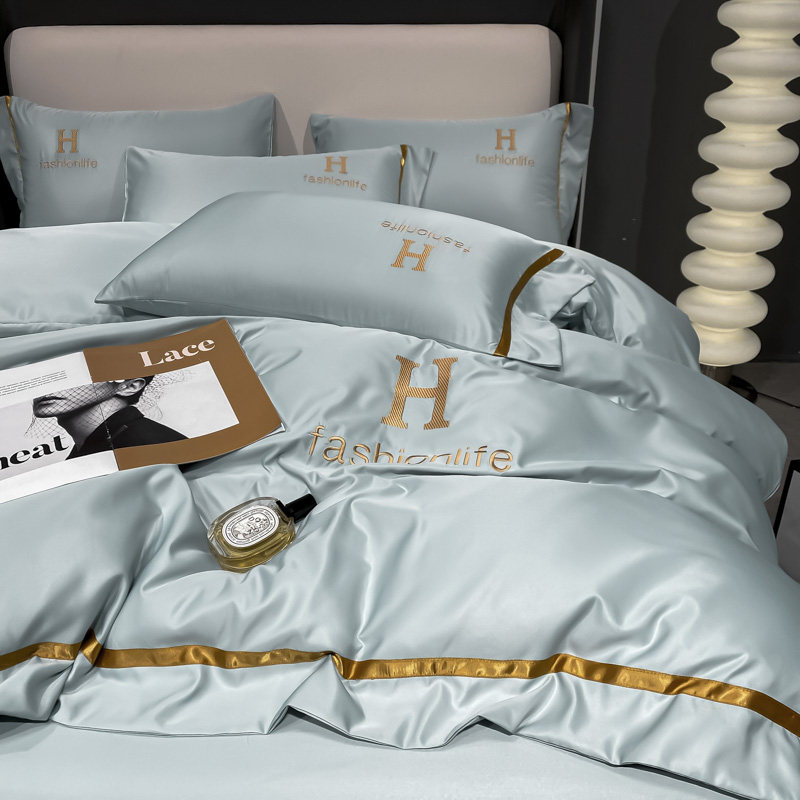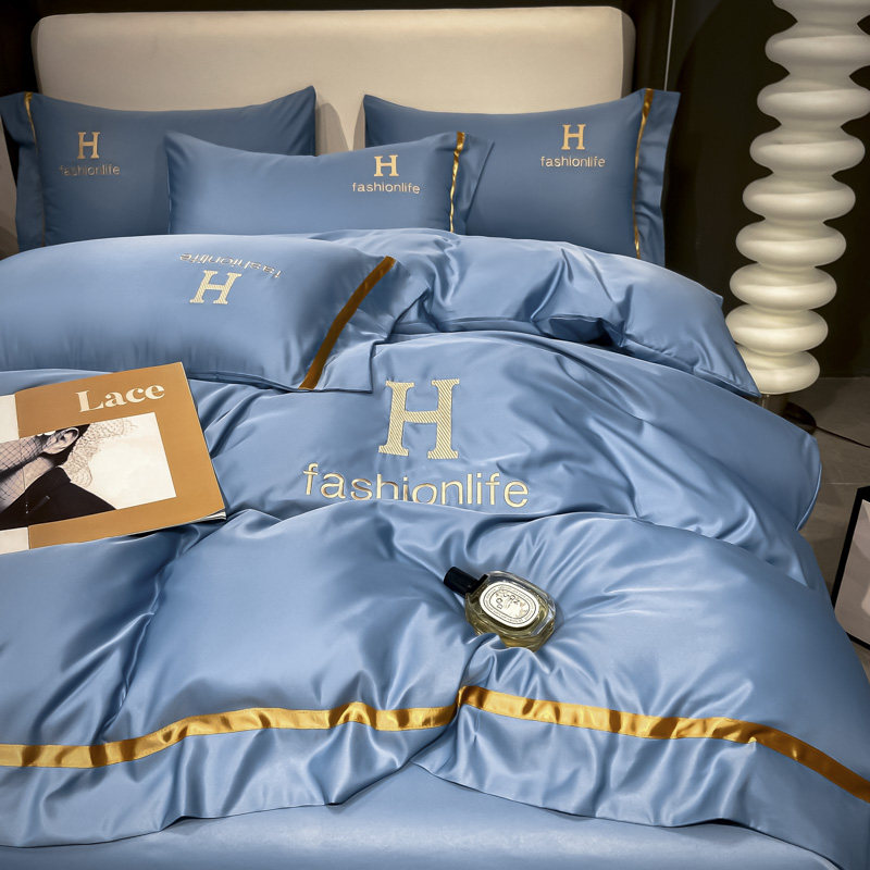 Summer simple European ice wire four pieces of pure colored double silk linen embroidered bed with bed bed
