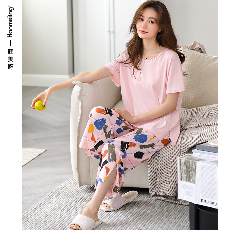 Sleepwear Woman Summer Thin short sleeve Modale Big size Home Summer Cool Sensation Ice Silk Seven Pants Two-piece Style Suit