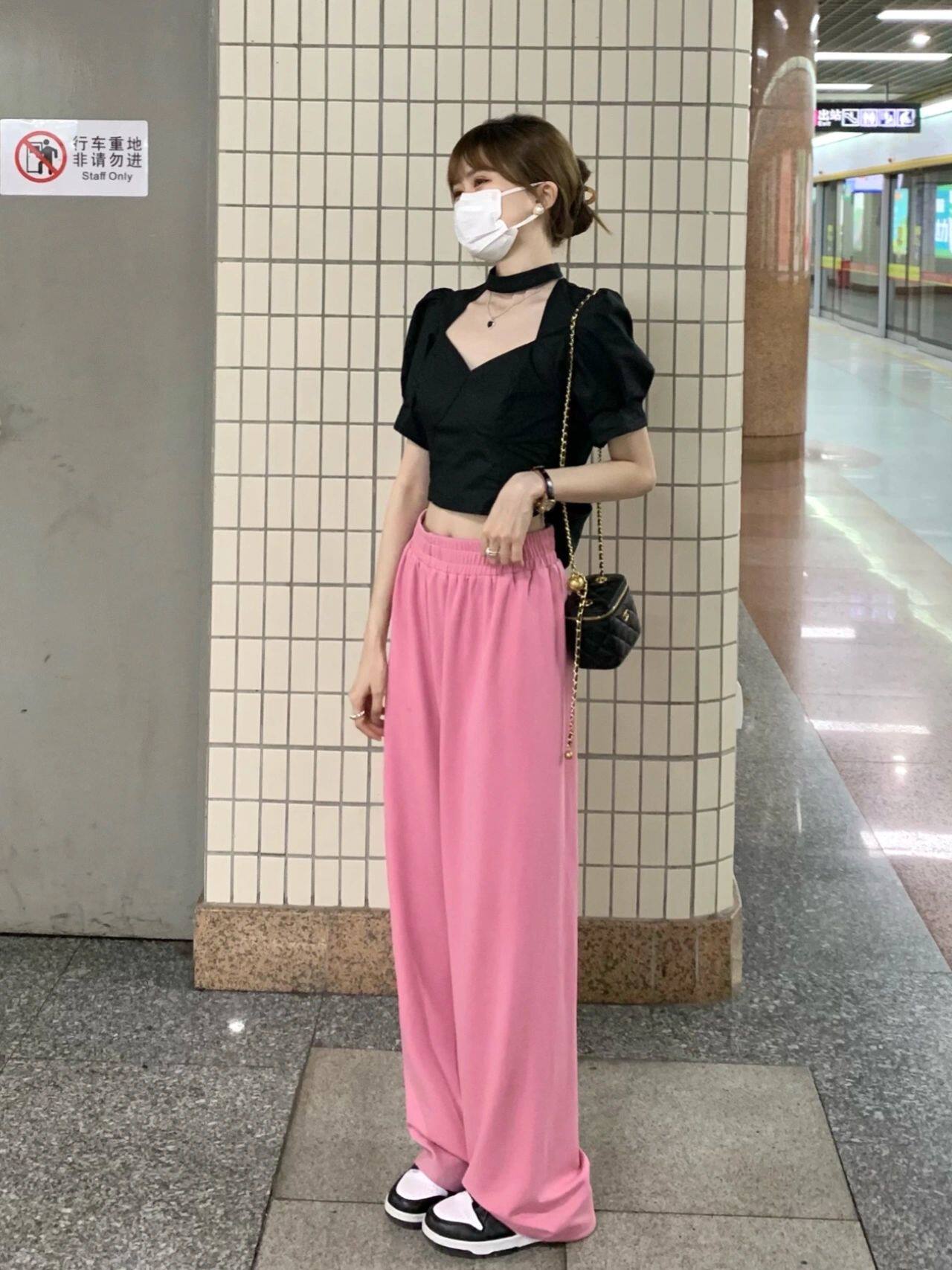 Black Hollowed-out Blouse Pink Casual Long Pants