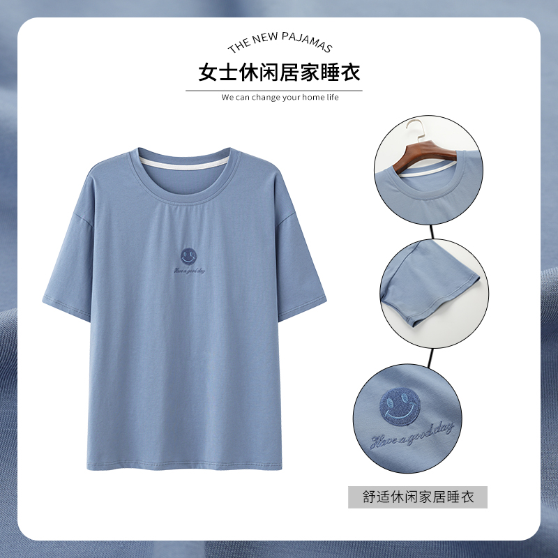 Gujin@Pajamas Ladies summer pure cotton short-sleeved thin one-piece top round neck pullover cotton large size home service