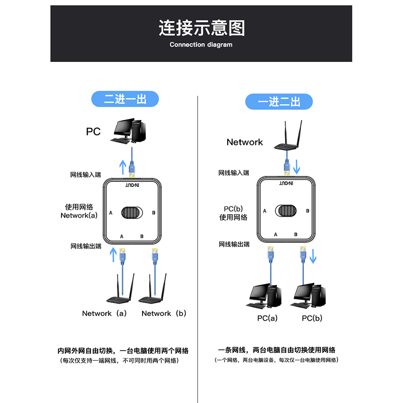 Gigabit network switch RJ45 power-free 2 in 1 out network line sharer passive internal and external network random switch