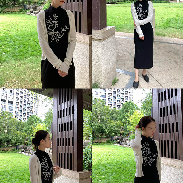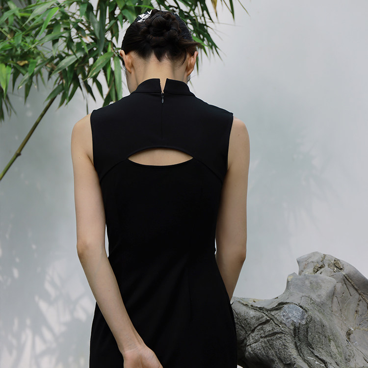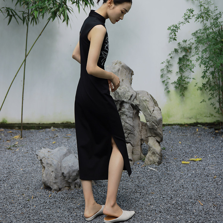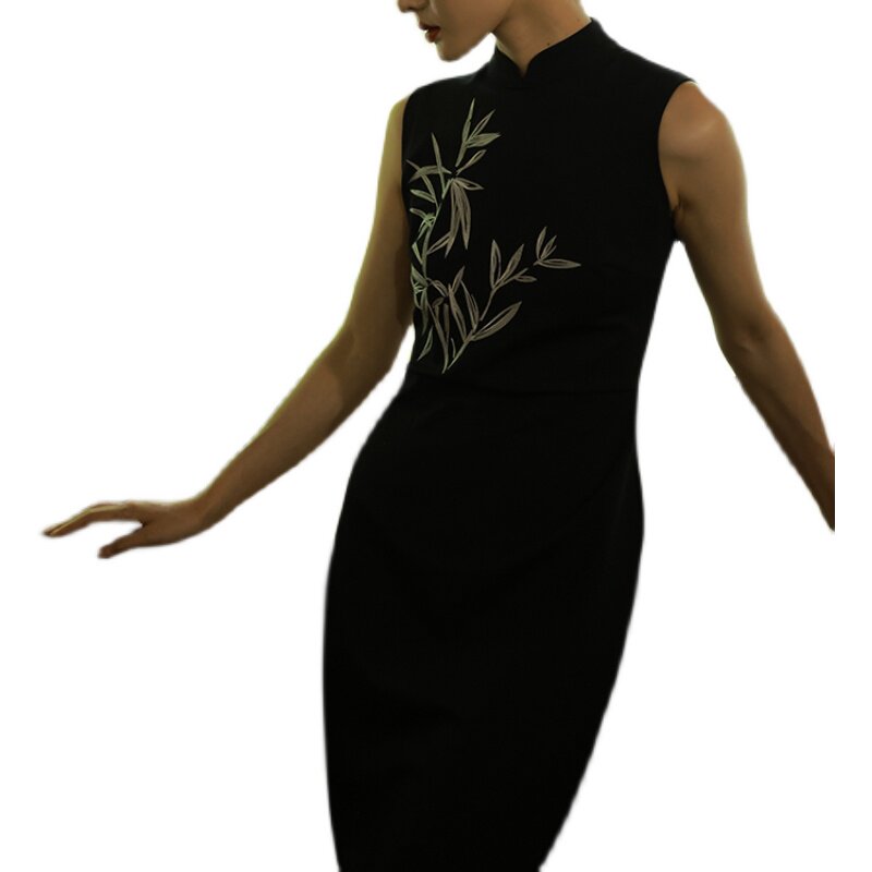Small deer miya "bamboo" series original innovative Chinese style national wind embroidery qipao sleeveless little black dress with long dresses summer-Taobao