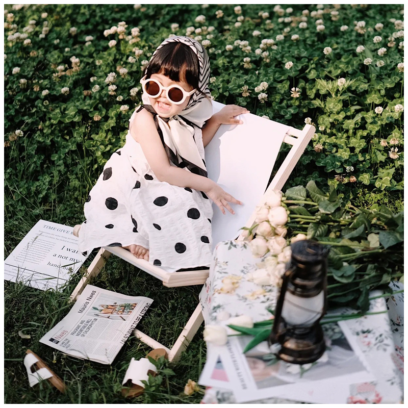 Child Exterior View Brigade Pat Props White Beach Chair Girl Wave Dot Dress With Striped Headscarf Sunglasses Crub