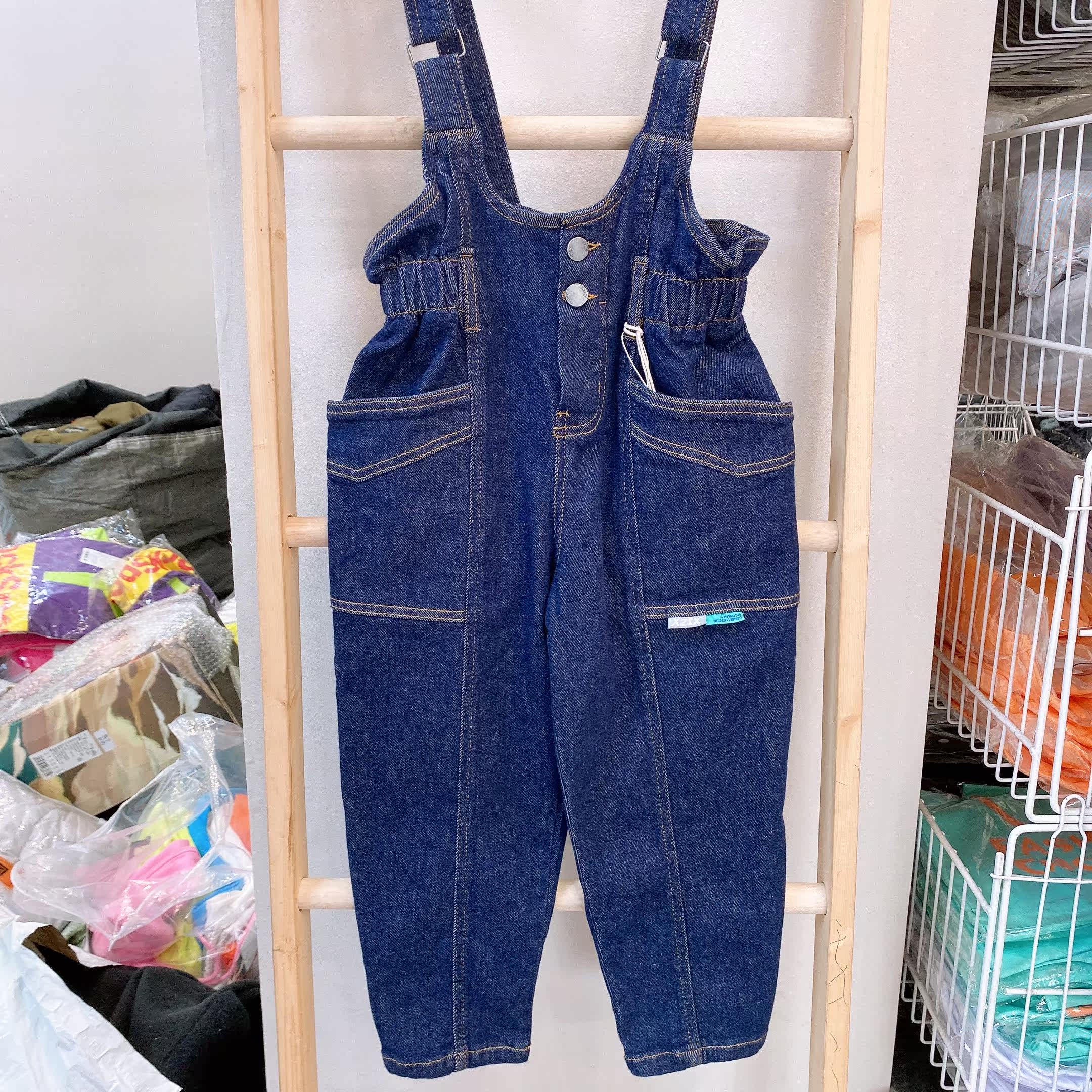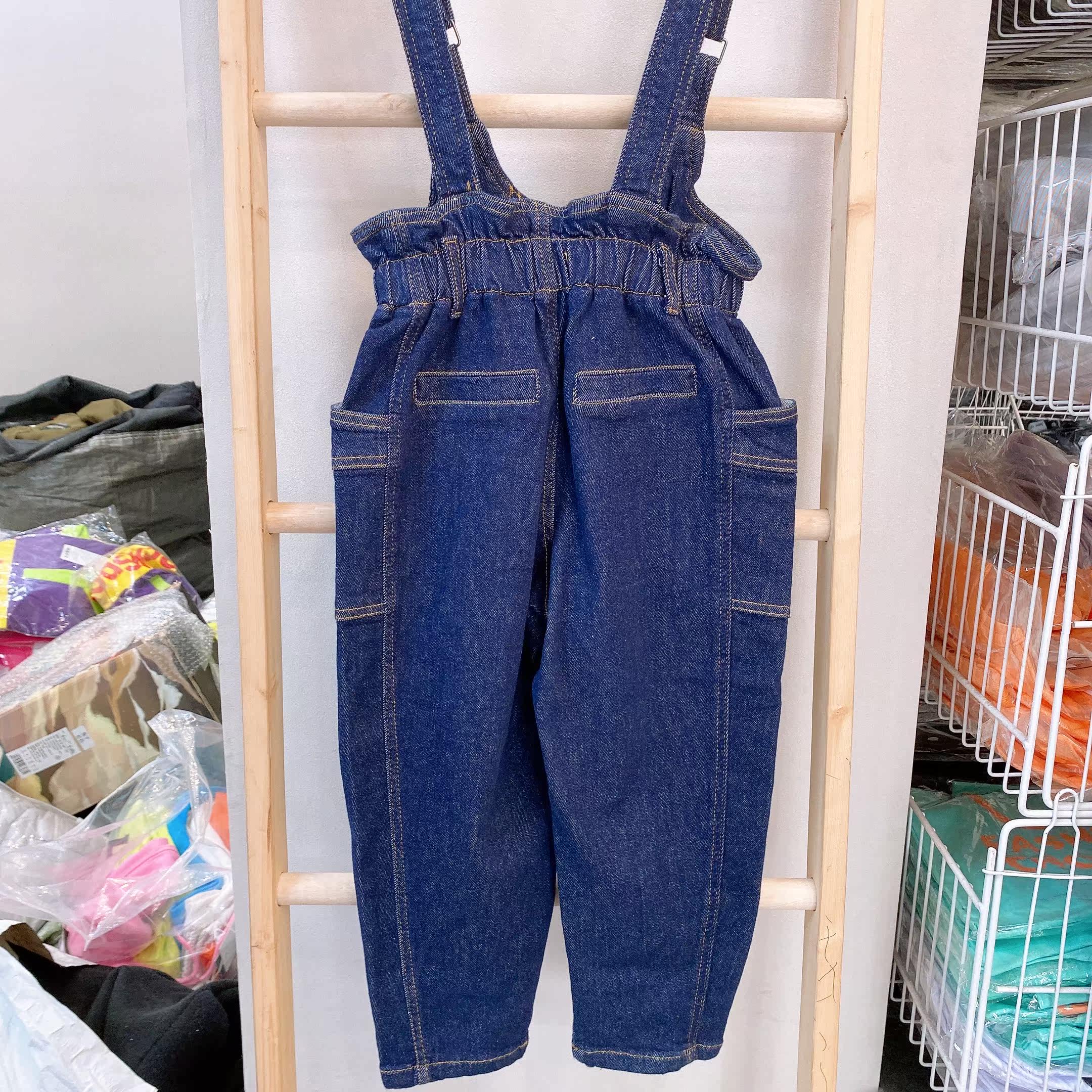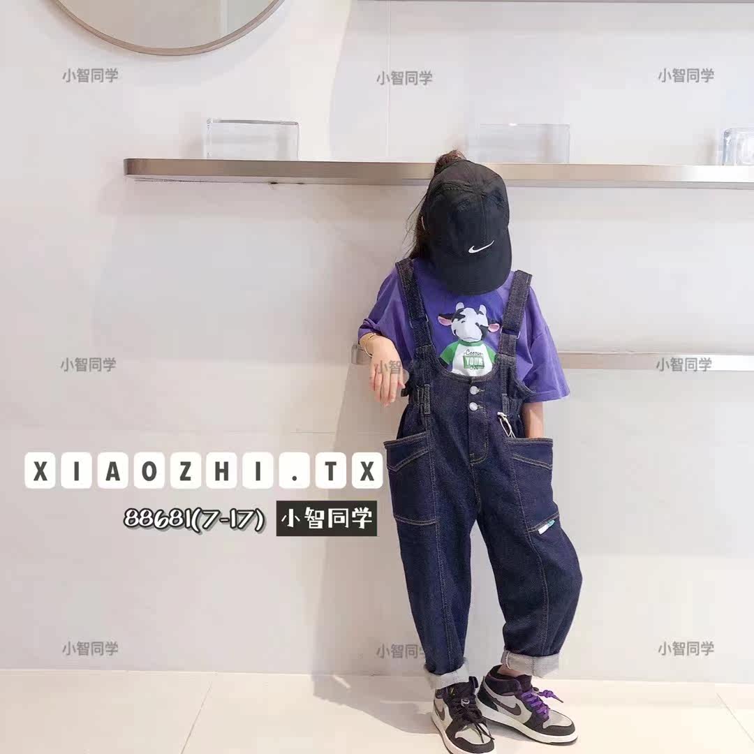 Little classmate spring and autumn children's middle and big children Korean version of foreign style soft elastic primary color pocket denim overalls 88681