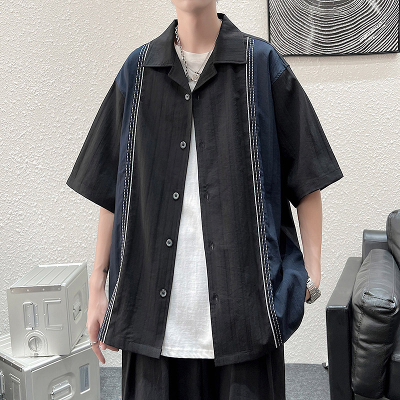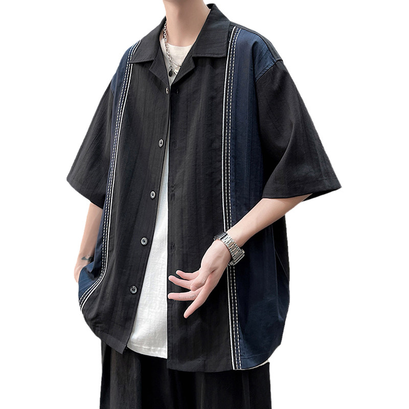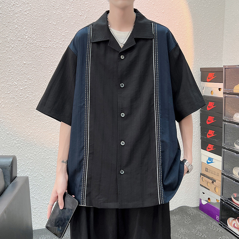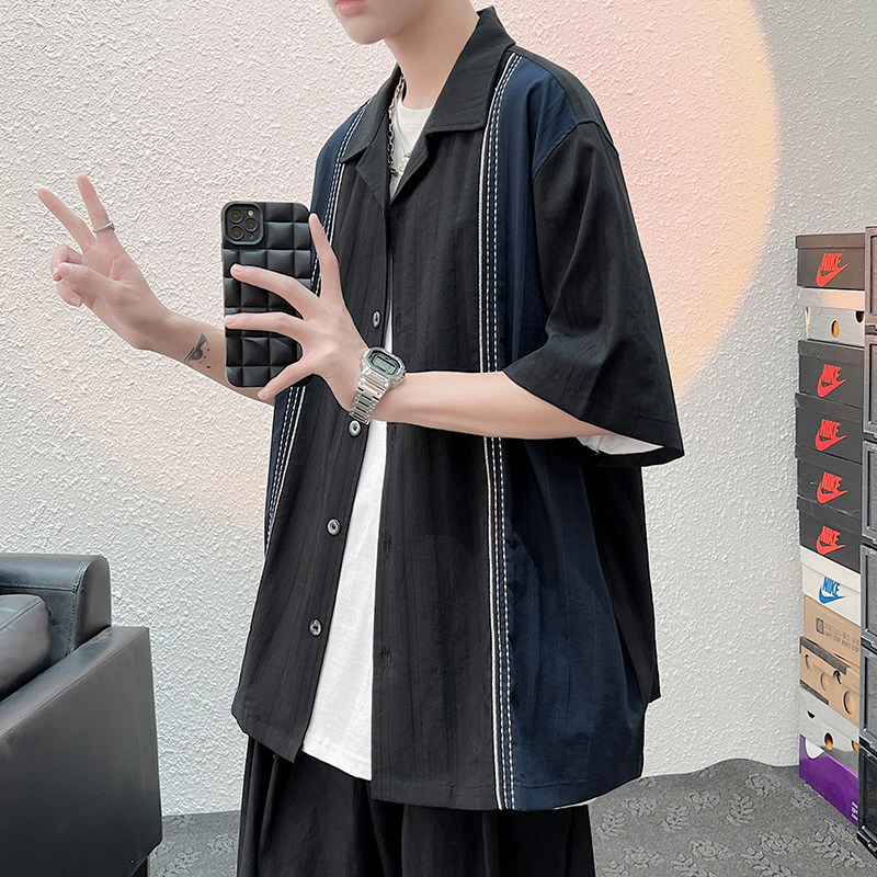 Splicing embroidery shirt men's short-sleeved tide brand Hong Kong style five-point sleeve top summer loose casual Japanese shirt half-sleeve