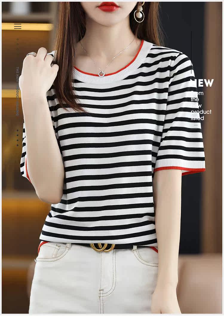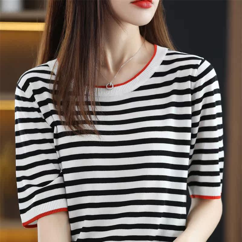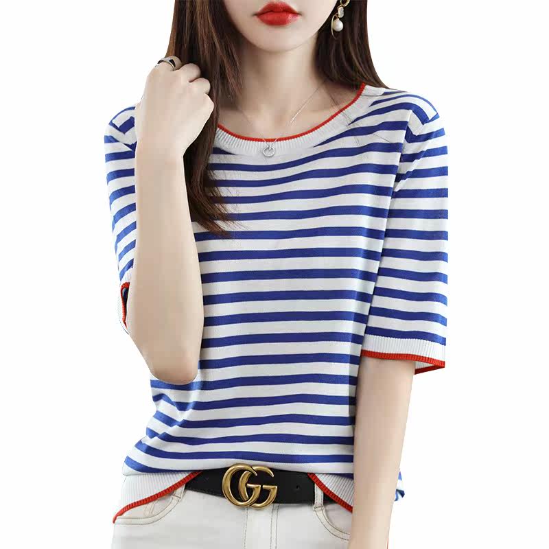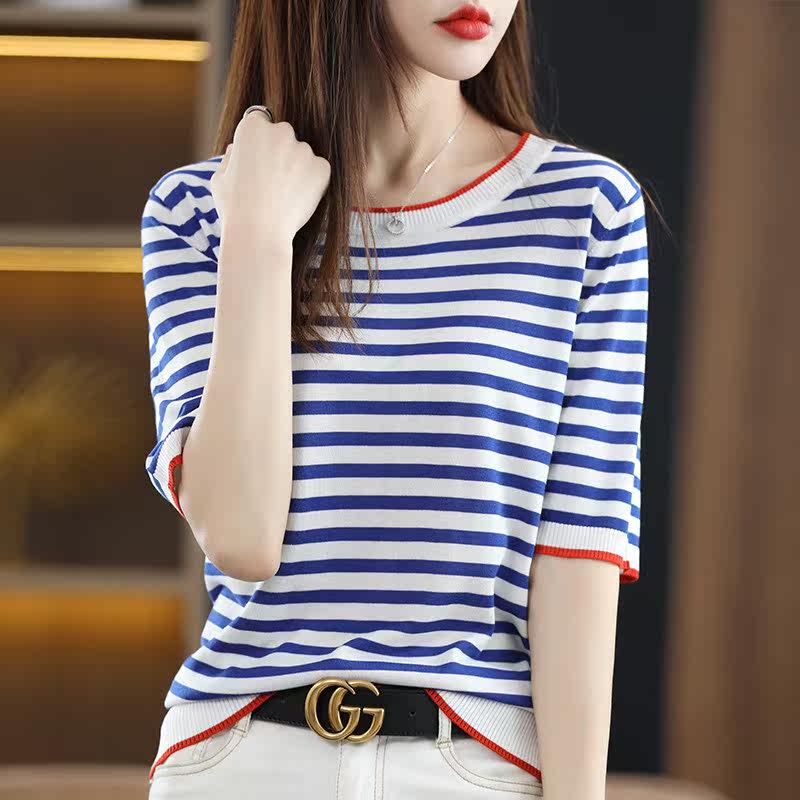 2022 summer Tencel round neck knitted short-sleeved women's thin section loose striped navy style age-reducing half-sleeved top T-shirt