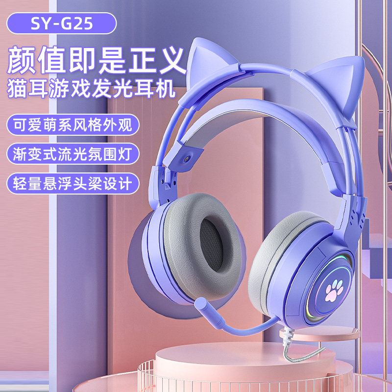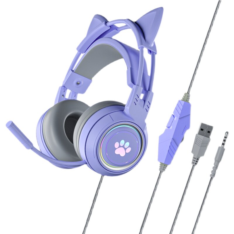 Purple cute glowing cat ears can remove headset cable headset mobile phone computer