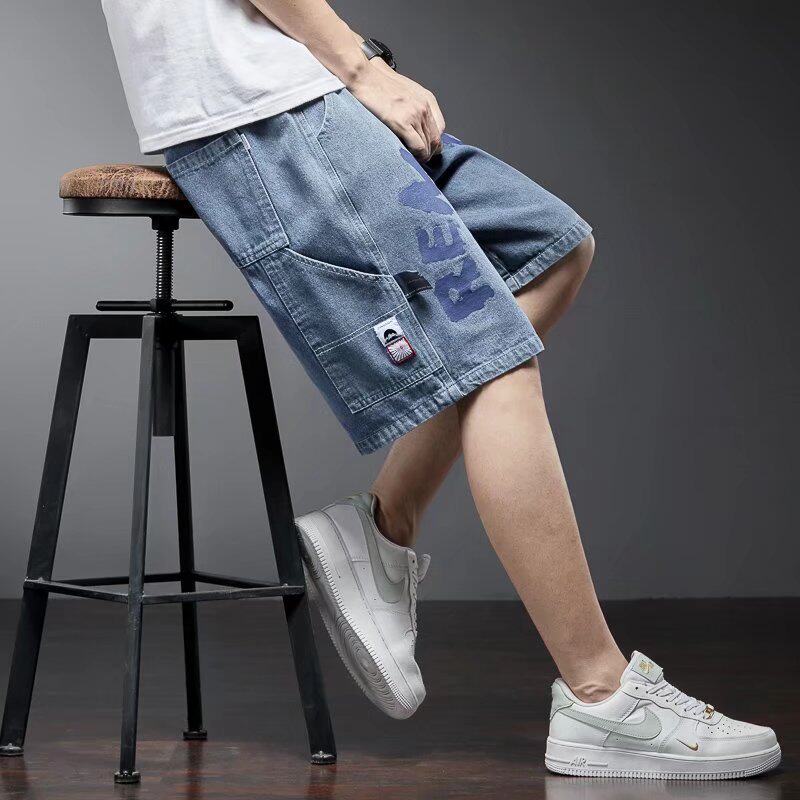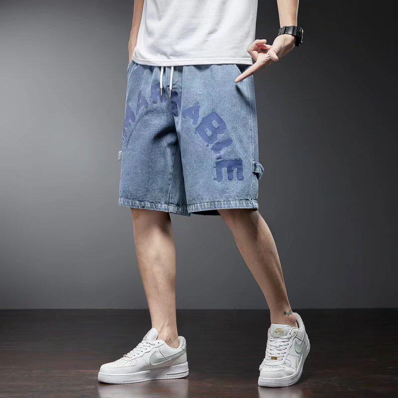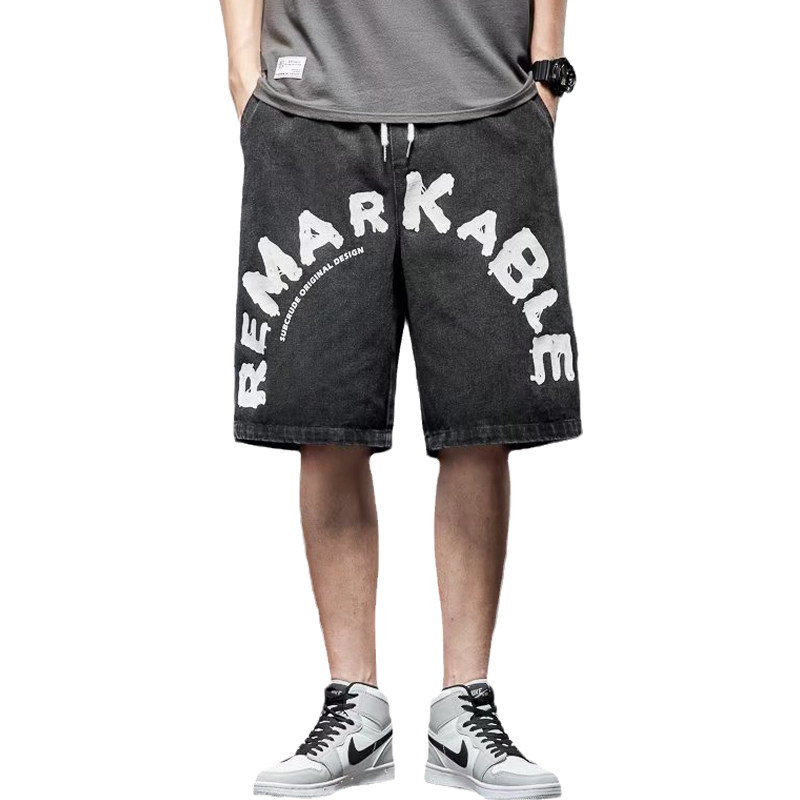 Letter Printed Denim Shorts Male Tide Card Ins Bursting Summer Thin tooling 50% Pants Loose straight drum Americana