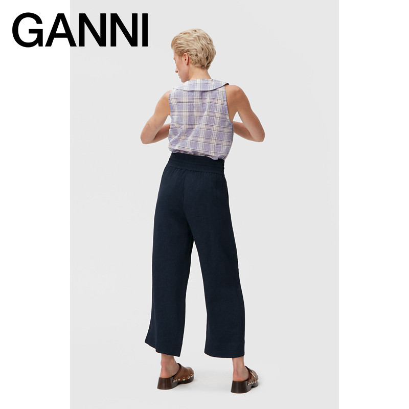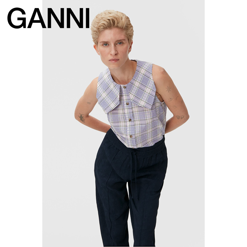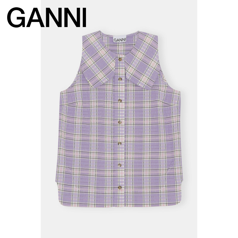 Ganni women's 2022 new purple plaid print straight seersucker sleeveless shirt F7075276