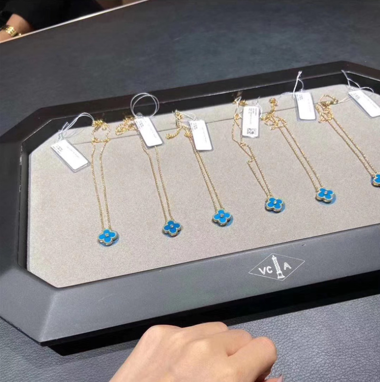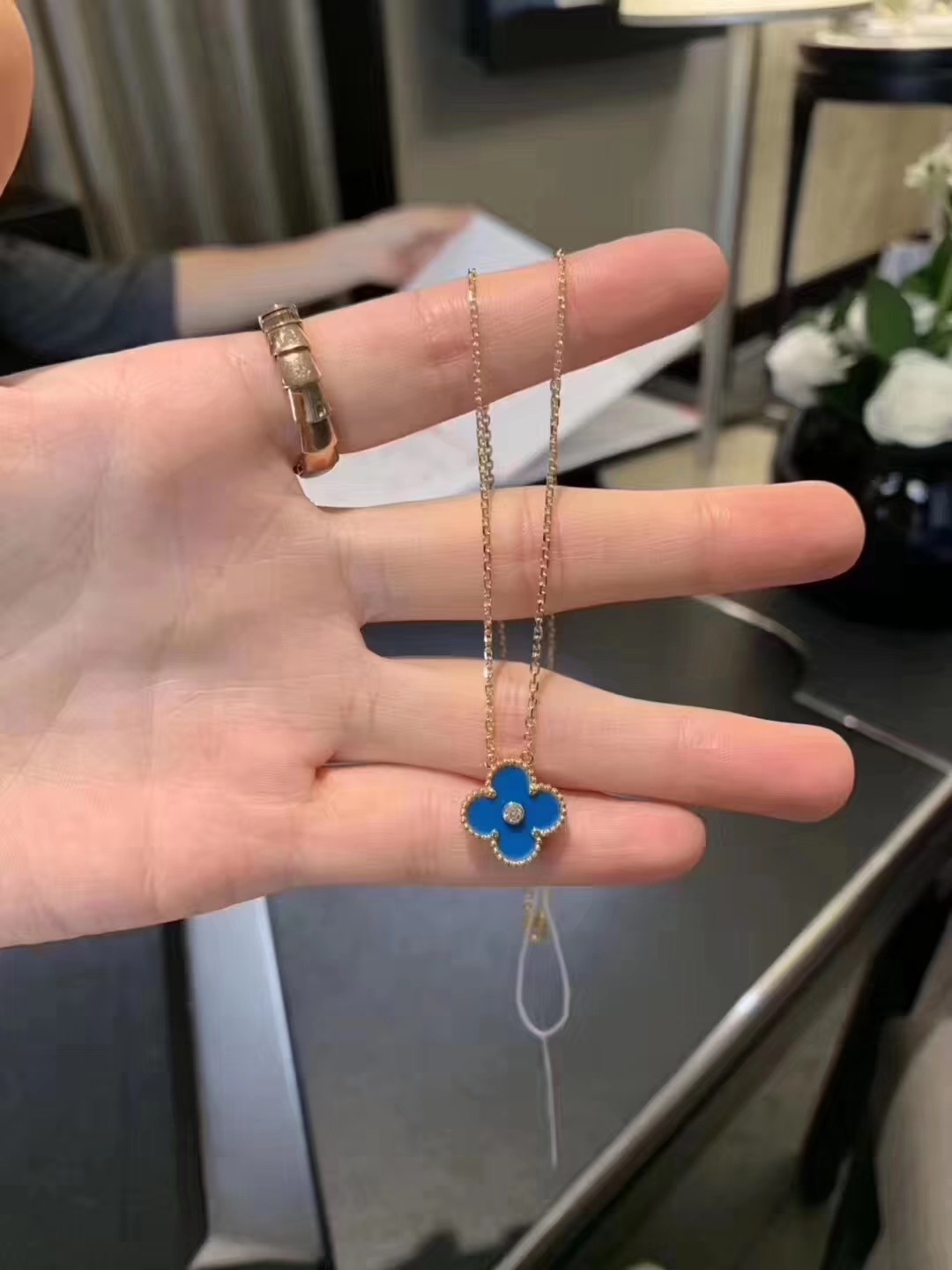 Spot VCA Van Kavan? 18k Gold Qualifies Single Diamond Four Leaf Grass Necklace Blue Agate Pendant Lock Bones Chain Woman