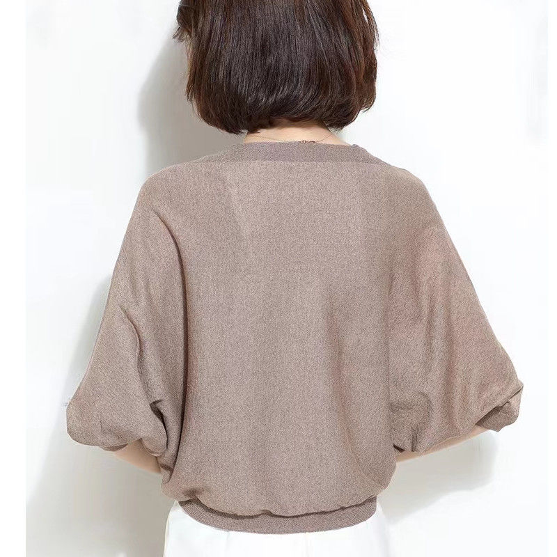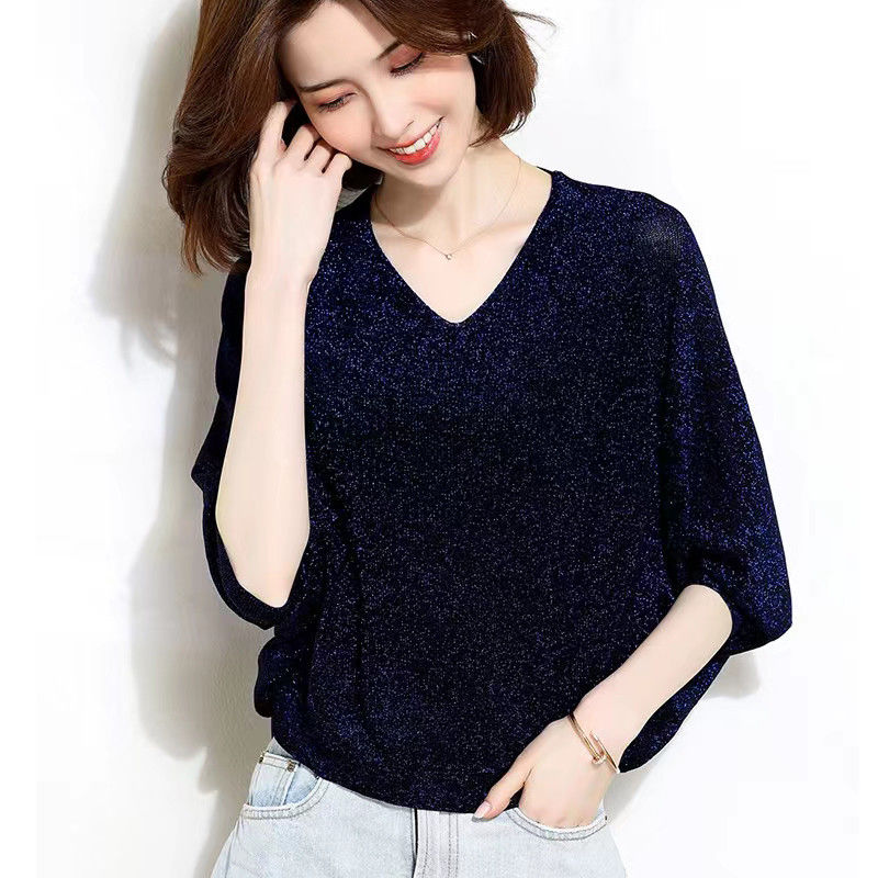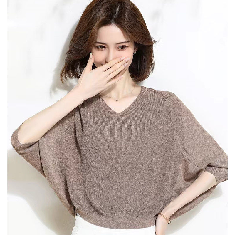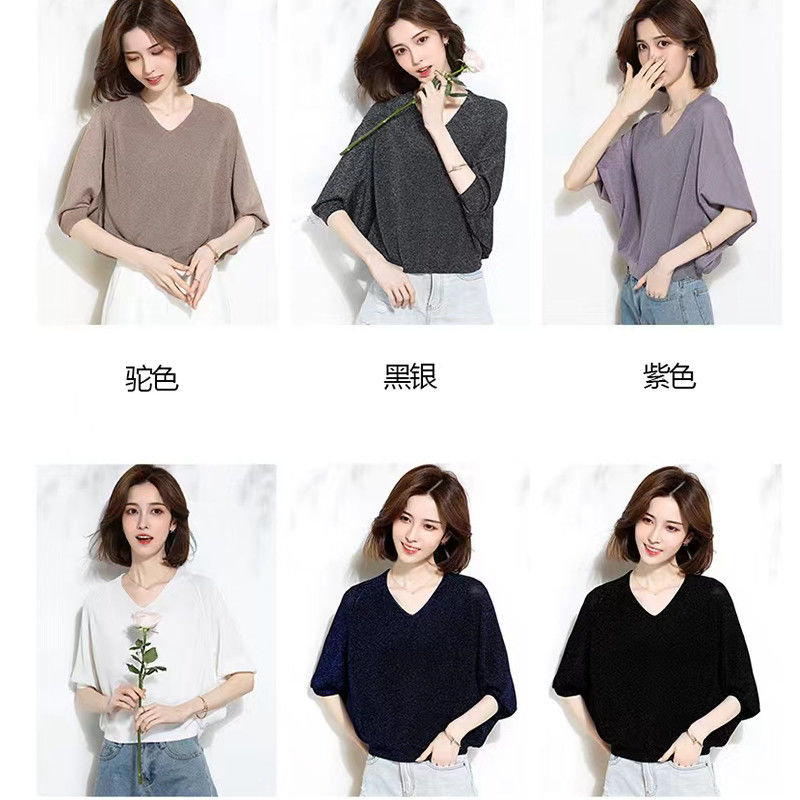 Bat-sleeve top women's ice silk knitted sweater women's top bat-shirt V-neck half-sleeved flat bat T-shirt short-sleeved summer loose - Taobao
