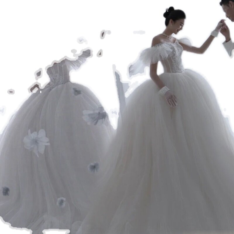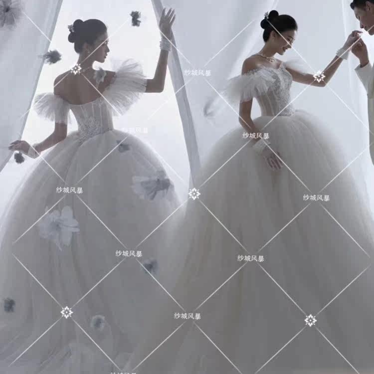 New photo studio theme wedding photography photo photo Korean style light luxury one-shoulder princess style trailing white gauze dress