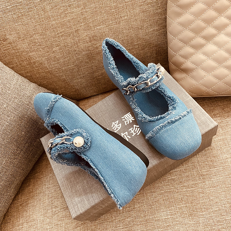 2022 autumn new retro Mary Jane women's shoes round toe thick heel flat shoes MIU* denim blue 40 large size 41