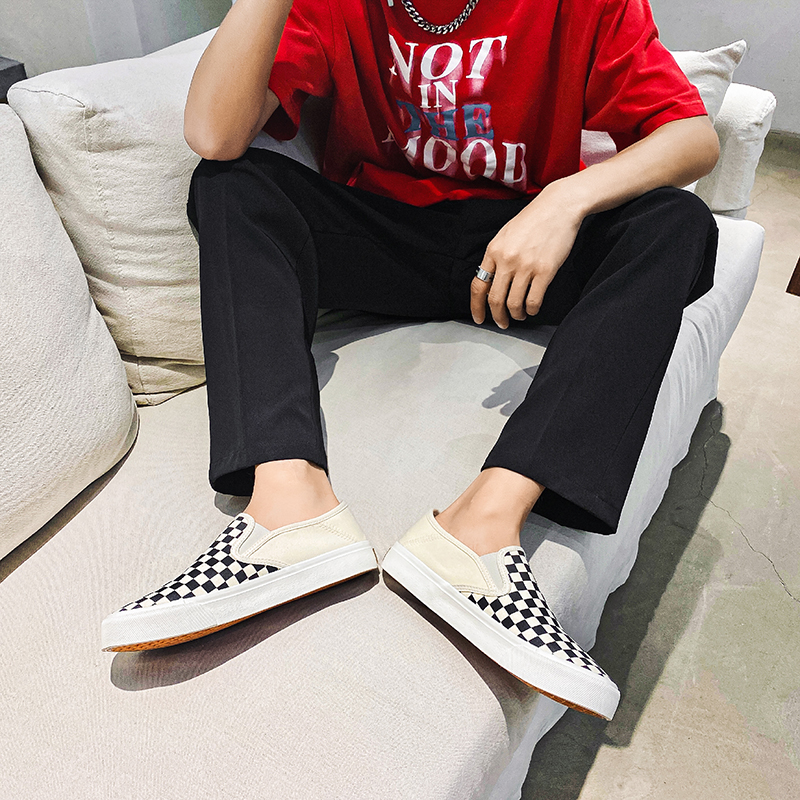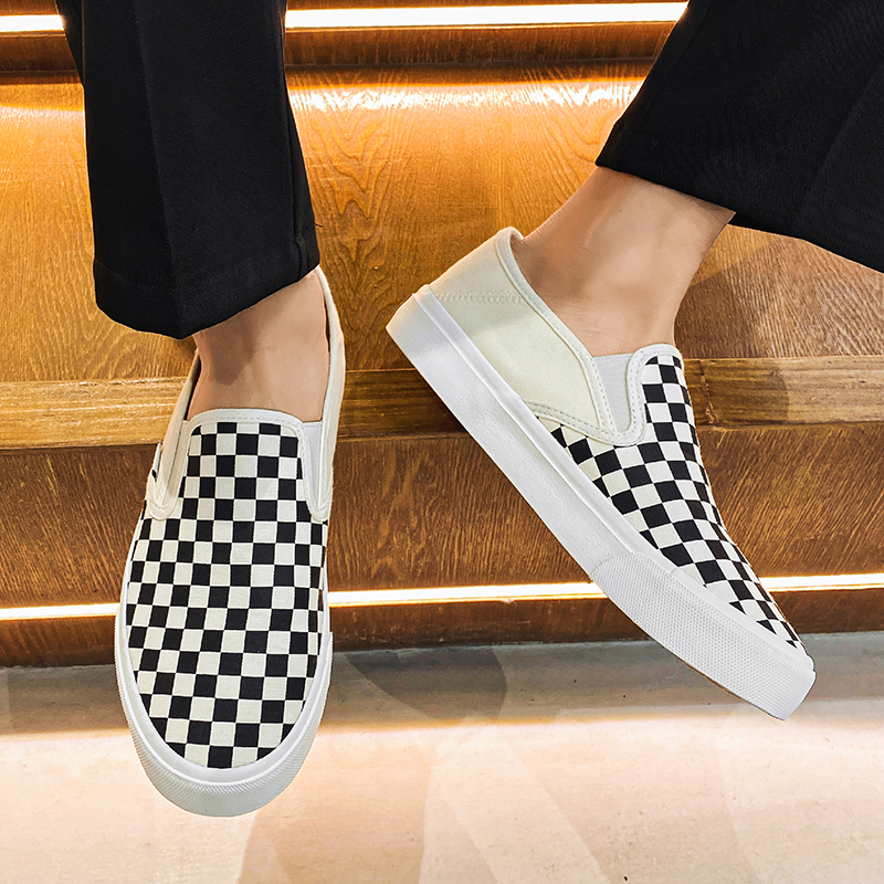 Black and white checkerboard plaid slip-on shoes couple canvas shoes men's breathable autumn skateboard shoes youth thin lazy shoes