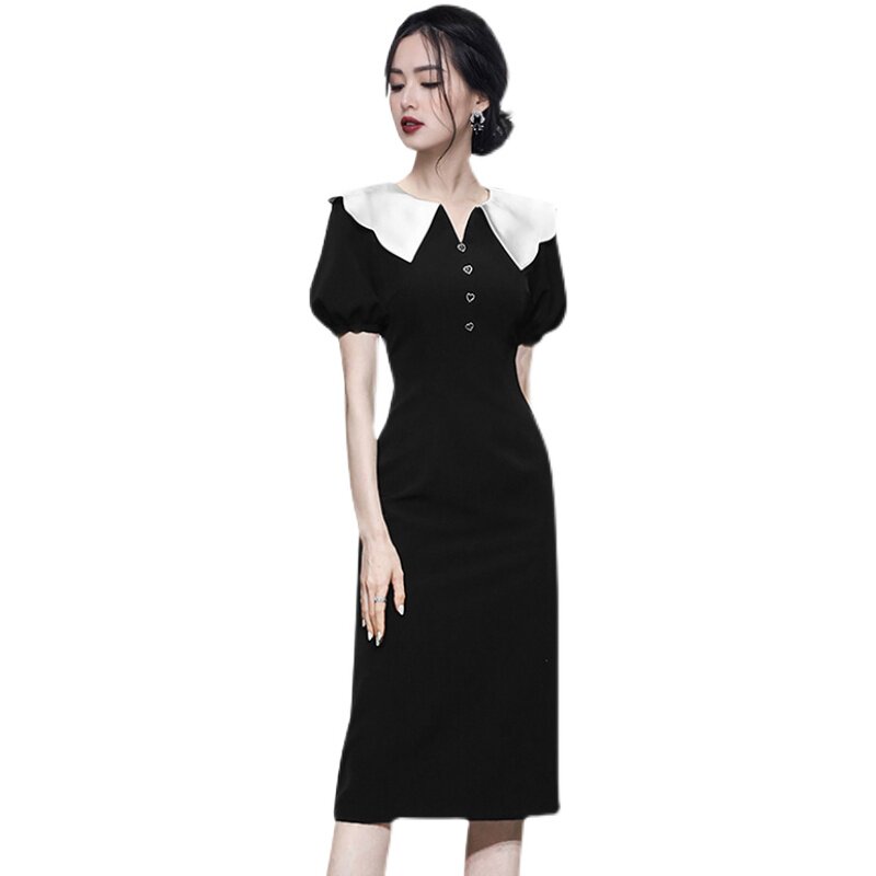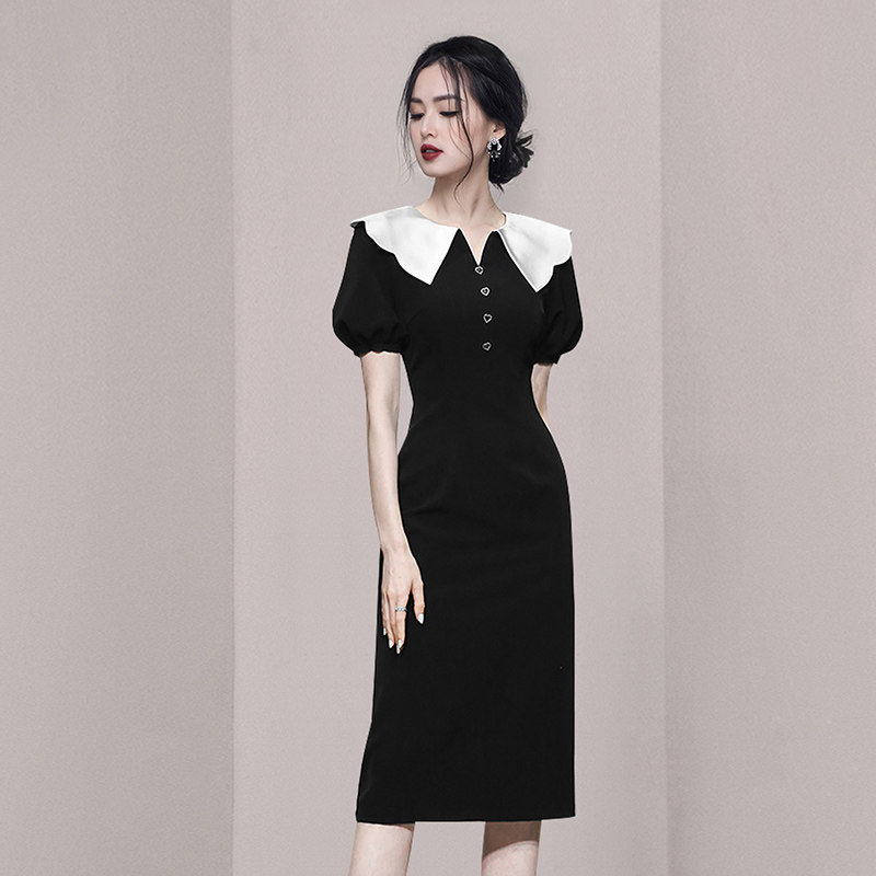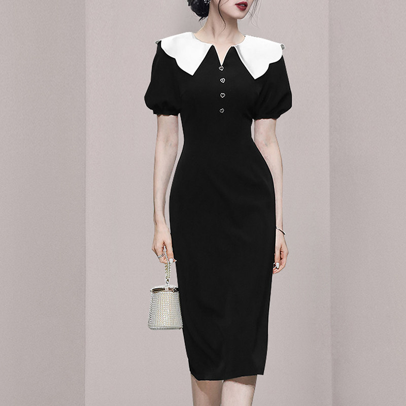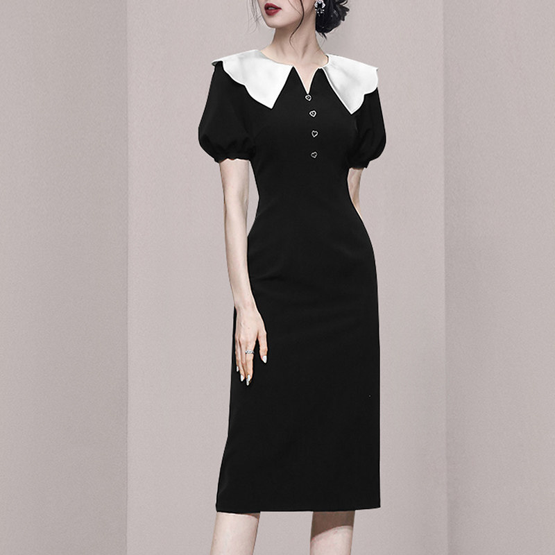 HiSunday puff sleeve French temperament slim contrast color doll collar little black dress Hepburn style jumpsuit qun