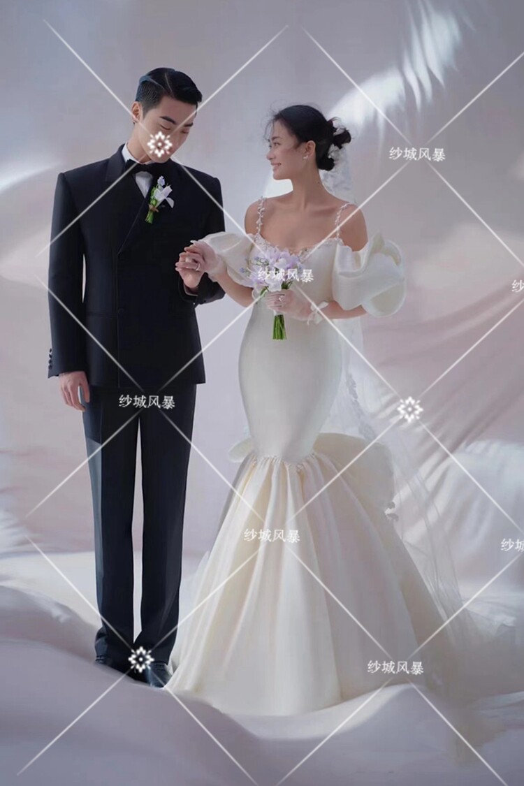 Photo studio theme clothing Korean style sling puff sleeves fishtail satin wedding dress couple photo photography photo white dress