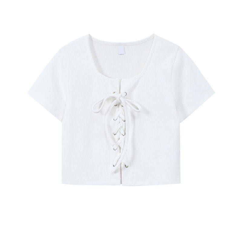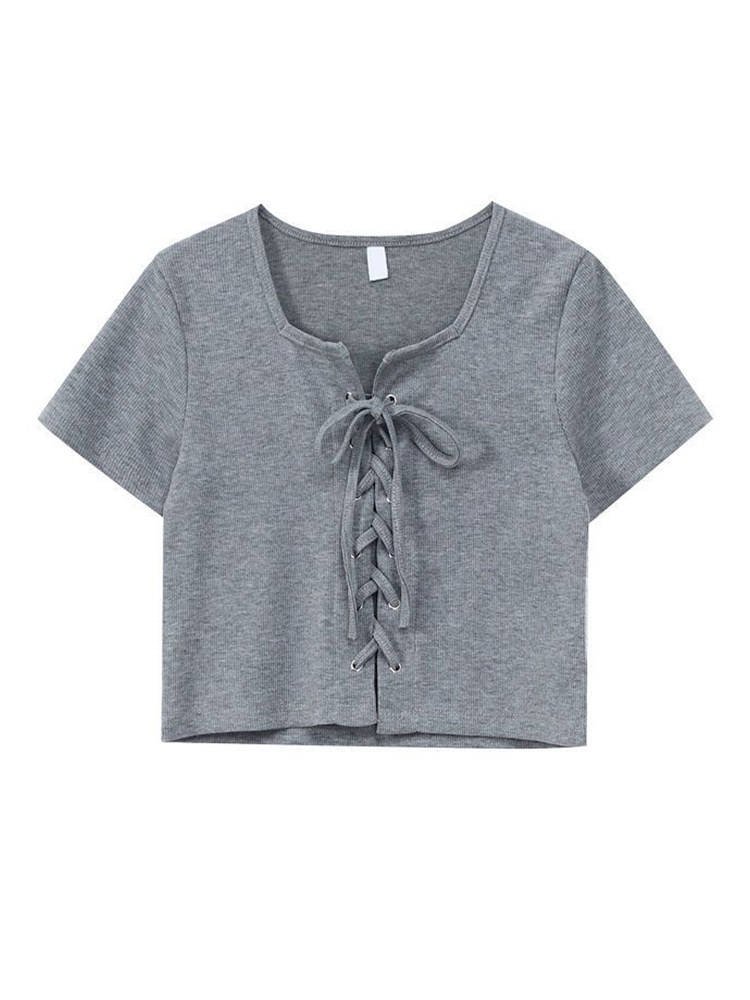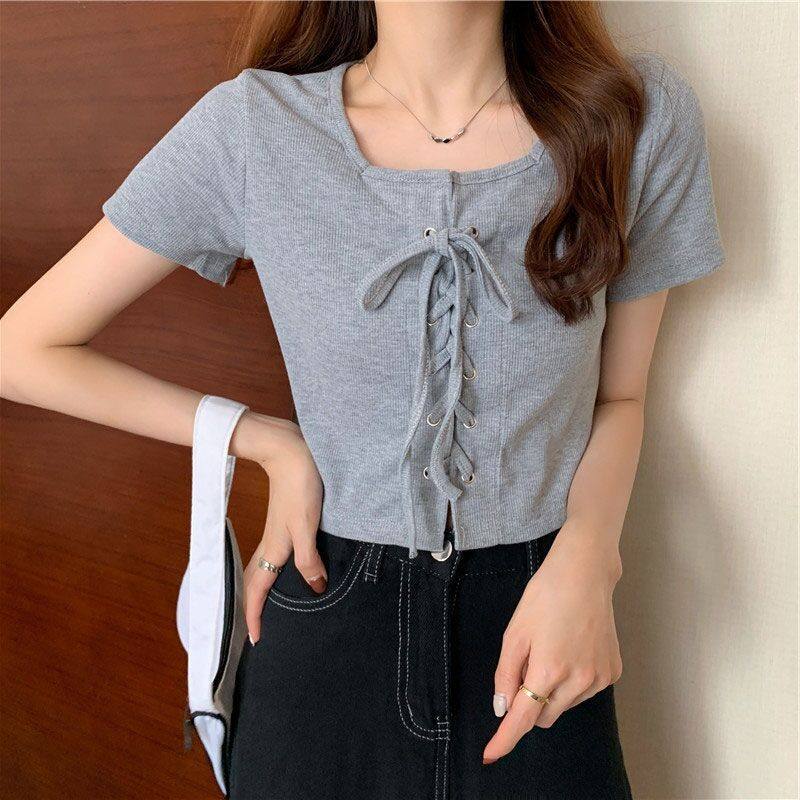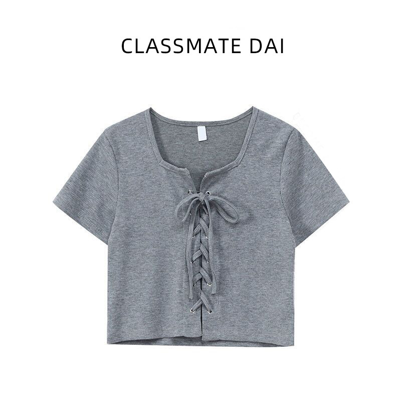 Classmate Dai short gray short-sleeved T-shirt women's slim fit and slim summer niche design square collar top