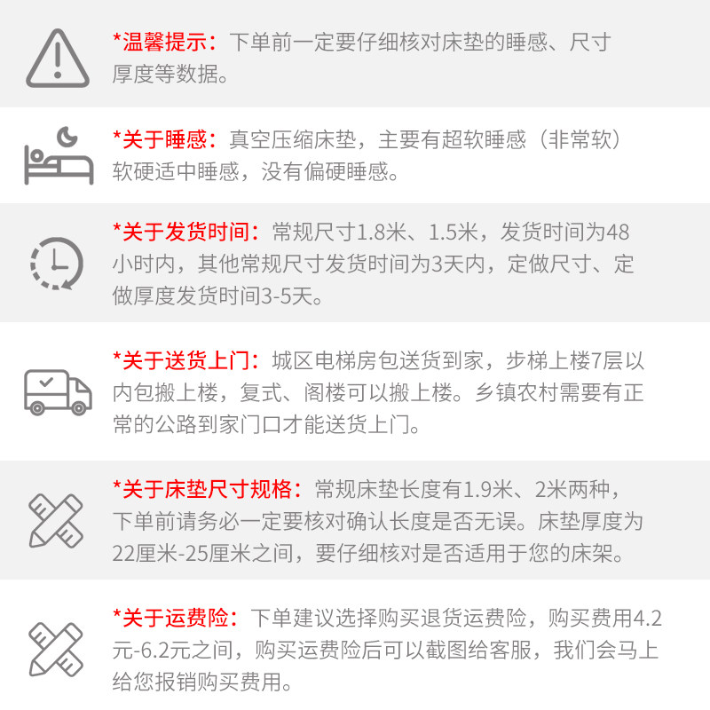 Before placing an order, please be sure to carefully check the sleeping feeling Size Thickness of the roll pack Super soft A-2cm latex Independent spring about 22cm thick