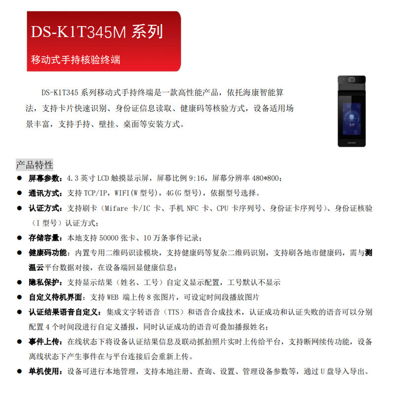 DS-K1T345MG-3XFQR Hikvision 4 3 inch touch screen handheld health QR code All
