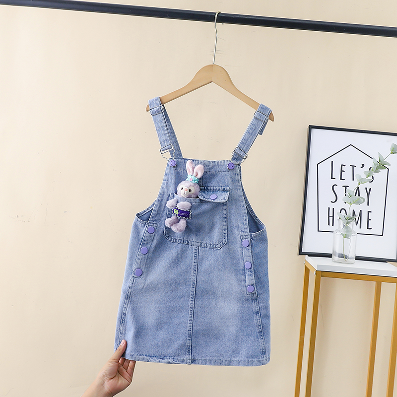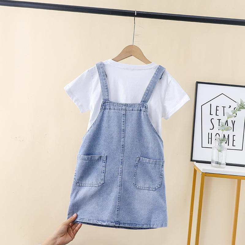 Girl Denim Harness Skirt Suit CUHK Child Han Version Fried Street Casual Short Sleeve T-shirt Pendant with skirt Two sets thin 9-Taobao