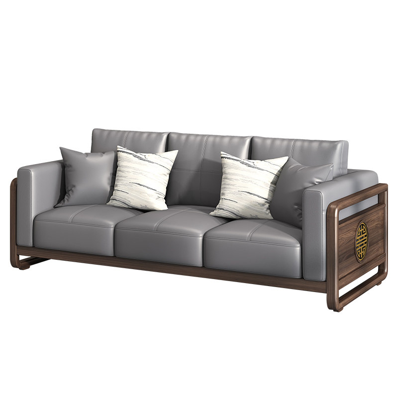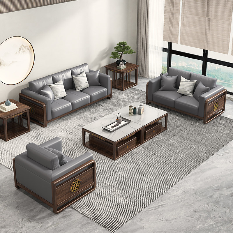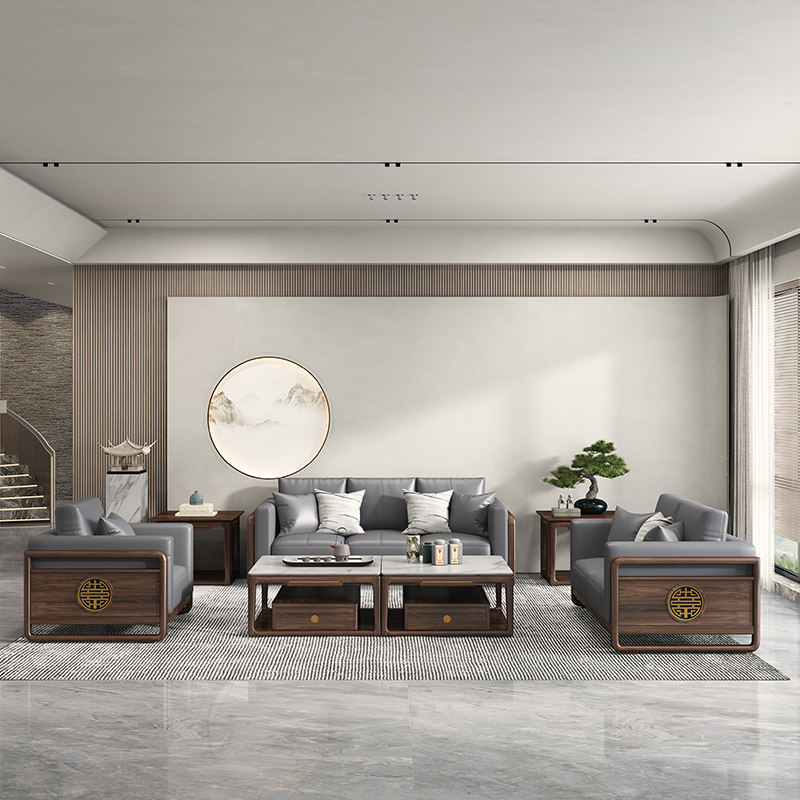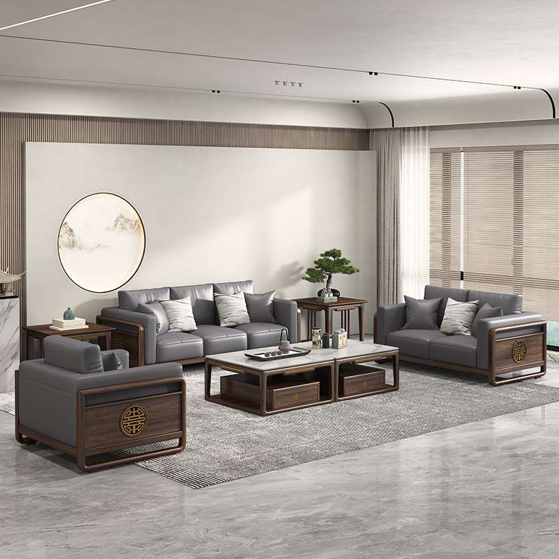 New Chinese style solid wood sofa combination leather Zen Chinese style villa Dapingshu living room Wujin wood furniture customization