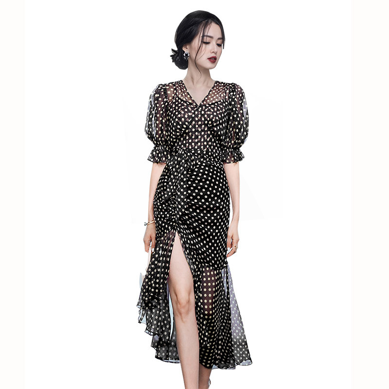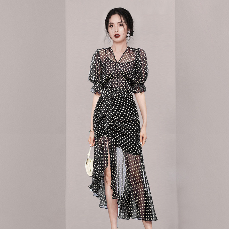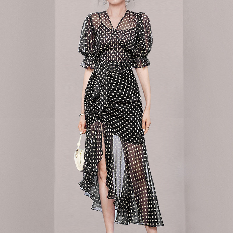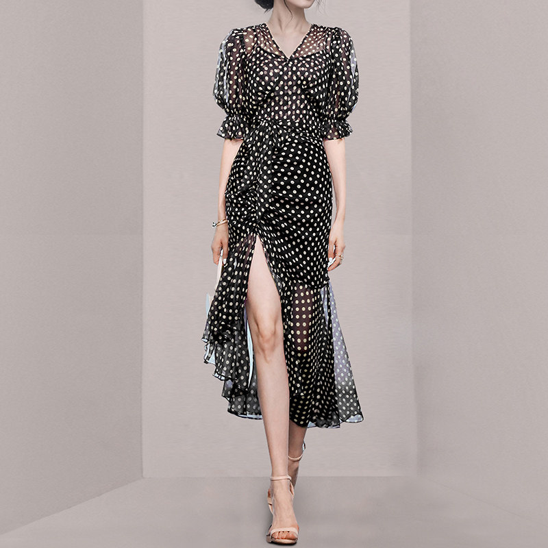 HiSunday summer Hepburn style black polka dot female Xia is thin high-end sexy slit irregular long qun